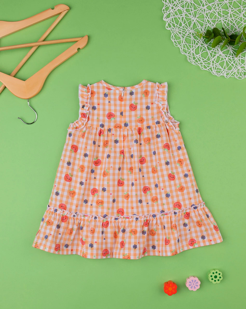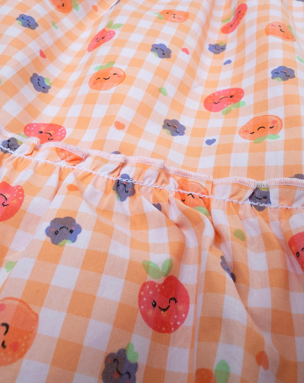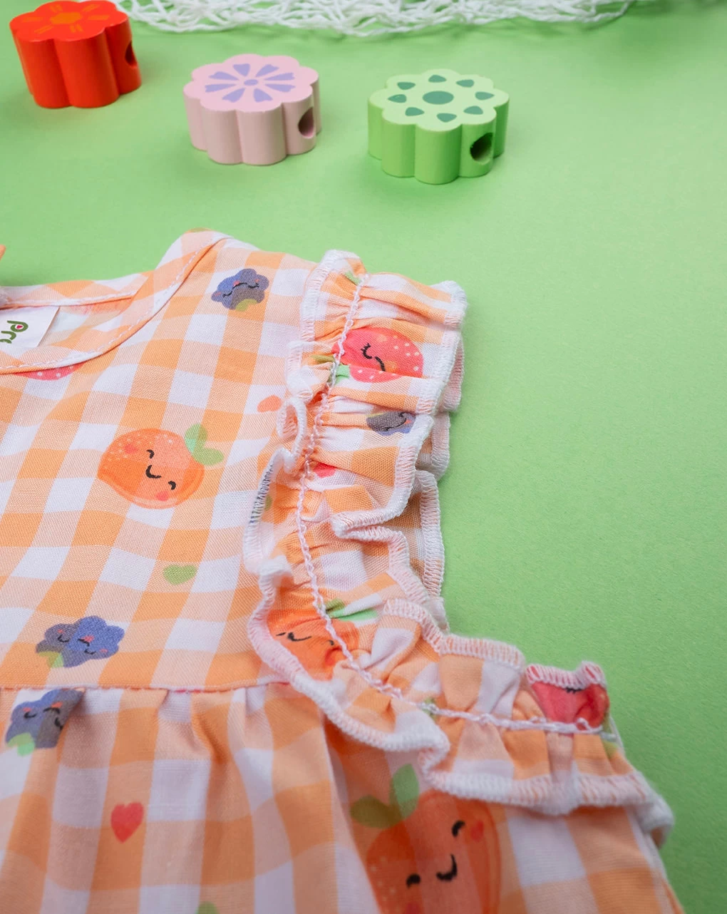 Casual abito a giromaniche da bambina in 100% cotone. Il capo si sviluppa su sfondo vichy quadrettato bianco e arancione, con stampa allover “Fruit” in tinta coordinata. Ulteriore dettaglio è rappresentato da bottoni ad asola fake in tinta panna applicati sul fronte. La vestizione è morbida e pratica grazie a zip sulla schiena. L’abito da bambina è adatto per occasioni casual. Accessori non in vendita. La confezione contiene solo il capo d’abbigliamento