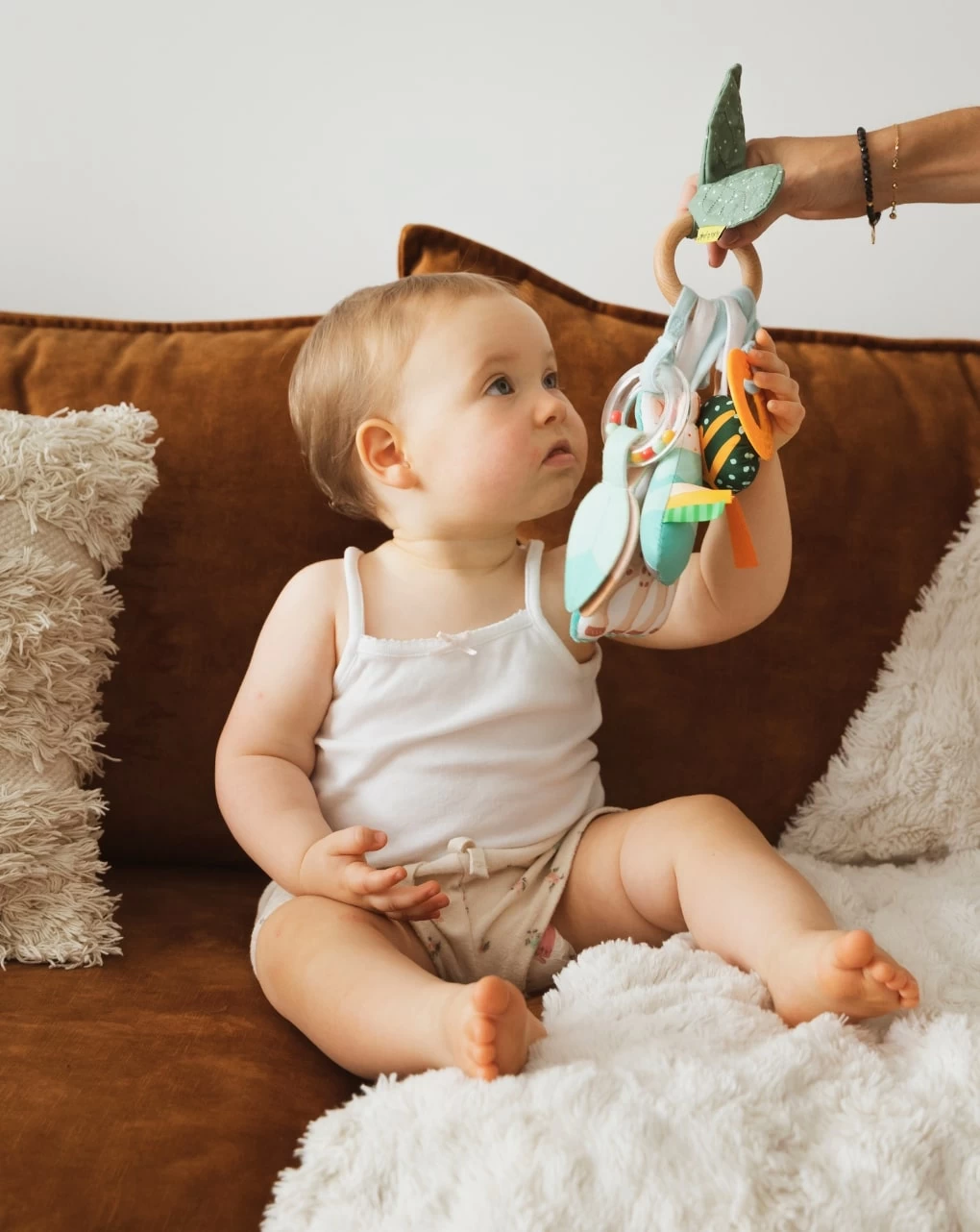 Un giocattolo ultra completo che offre ore di divertimento. Numerose attività da scoprire per stimolare tutti i sensi del neonato: materiali e superfici variegati, un sonaglio trasparente, un campanellino, un anello da dentizione, foglie fruscianti, un sonaglio a pressione.