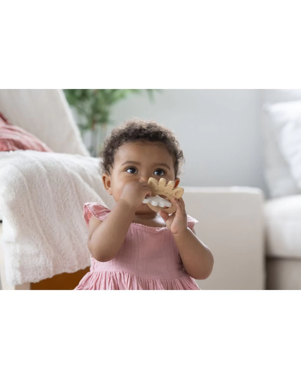 Realizzati al 100% in gomma naturale e legno dell’albero di gomma, questi 2 anelli di diversa durezza danno efficacemente sollievo alle gengive dei più piccoli.