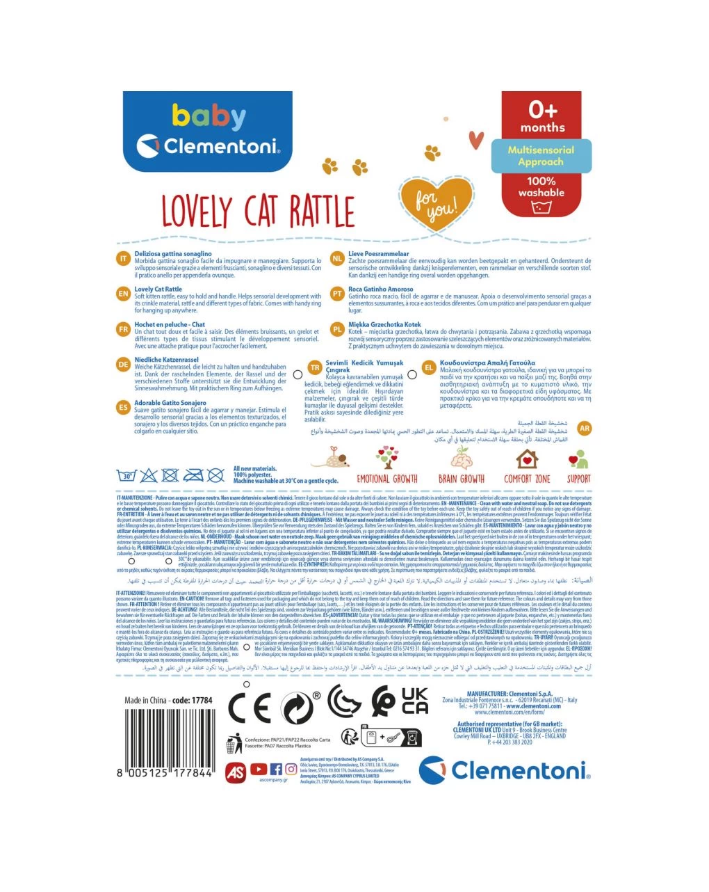 Un morbido gattino sonaglio Baby Clementoni per intrattenere i più piccoli con elementi multisensoriali. Una gattina con bastoncino facile da impugnare e maneggiare che supporta lo sviluppo sensoriale grazie agli elementi fruscianti nelle ali, al sonaglino e ai diversi tessuti. Dolce e tenera è tutta da coccolare e rappresenta una tenera amica che rassicura il bambino e incoraggia l’esplorazione sensoriale. Grazie al pratico anello la gattina è appendibile al passeggino, alla culla o ovunque si voglia, per portarlo sempre con sé. Supporta lo sviluppo dell’udito e della manualità e rafforza le capacità motorie e sensoriali. Ogni particolare è studiato per rendere coinvolgente ed emozionante l’utilizzo del peluche da parte del bambino e la scelta dei tessuti è frutto di un’attenta ricerca, per garantire la massima qualità e sicurezza durante il gioco. Sicuro e 100% lavabile in lavatrice. Un gioco prima infanzia ideale a partire dagli zero mesi, rappresenta il regalo per neonato perfetto.