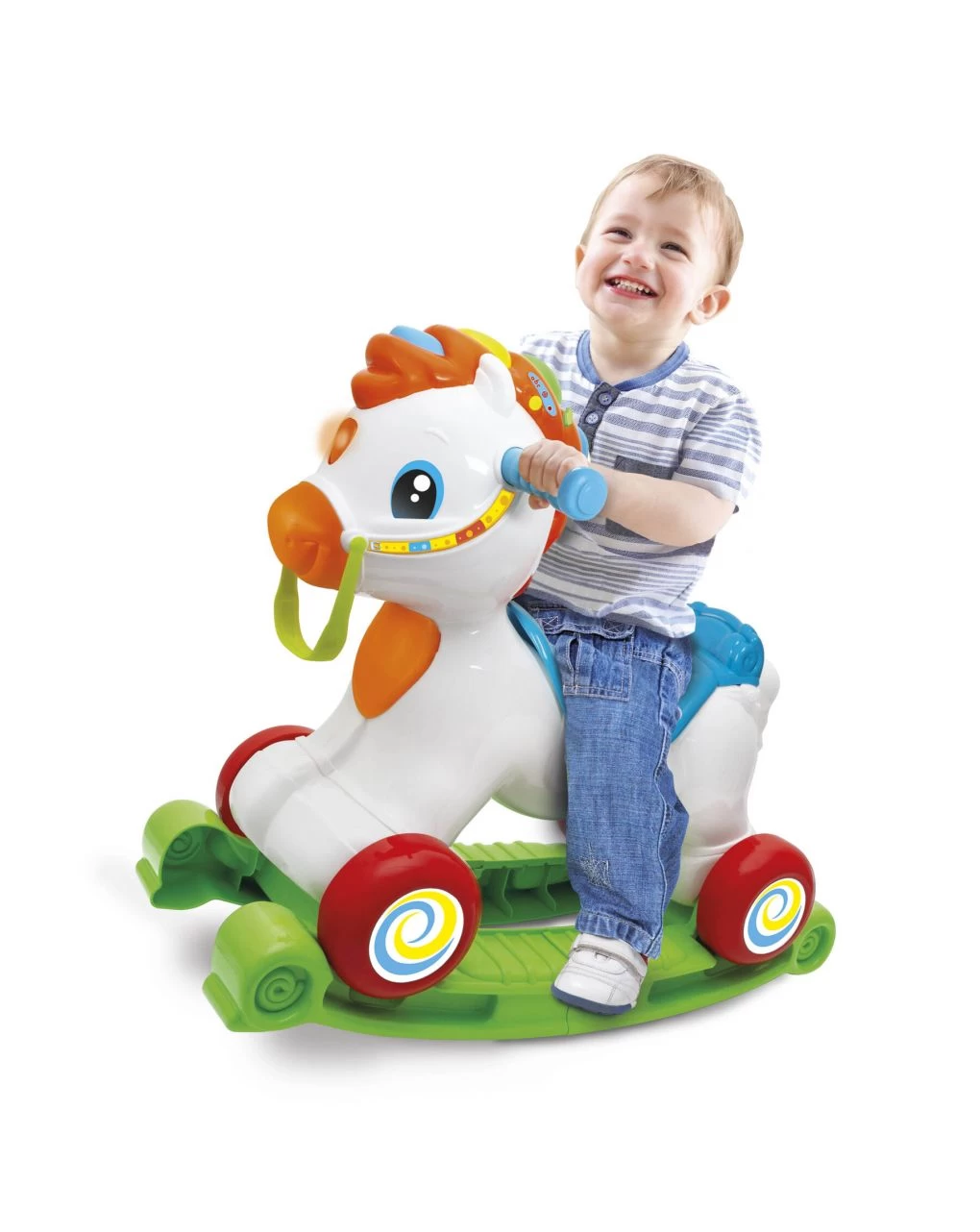 Un dolce cavallino a dondolo che è anche un cavalcabile e un centro attività interattivo!