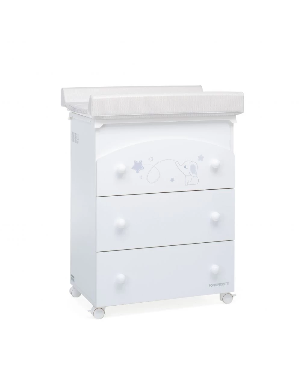 Bagnetto fasciatoio dotato di 3 cassetti con piano fasciatoio ribaltabile con chiusura ammortizzata.Vaschetta anatomica estraibile con possibilità di estrarre il cassetto superiore anche con la vaschetta inserita.Dotato di 4 ruote piroettanti di cui 2 con freno, incluso materassino fasciatoio e maniglie a pallina.Frontale cassetto con serigrafia. La struttura e cassetti in legno truciolare nobilitato, vaschetta in polipropilene, materassino in spugna ricoperta di PVC, maniglie in legno massiccio di faggio e ruote in nylon. Dimensioni: aperto: h 131 x 50 x 69 cm chiuso: h89 x 47 x 69 cm materassino 9×50 x 72 cm.
