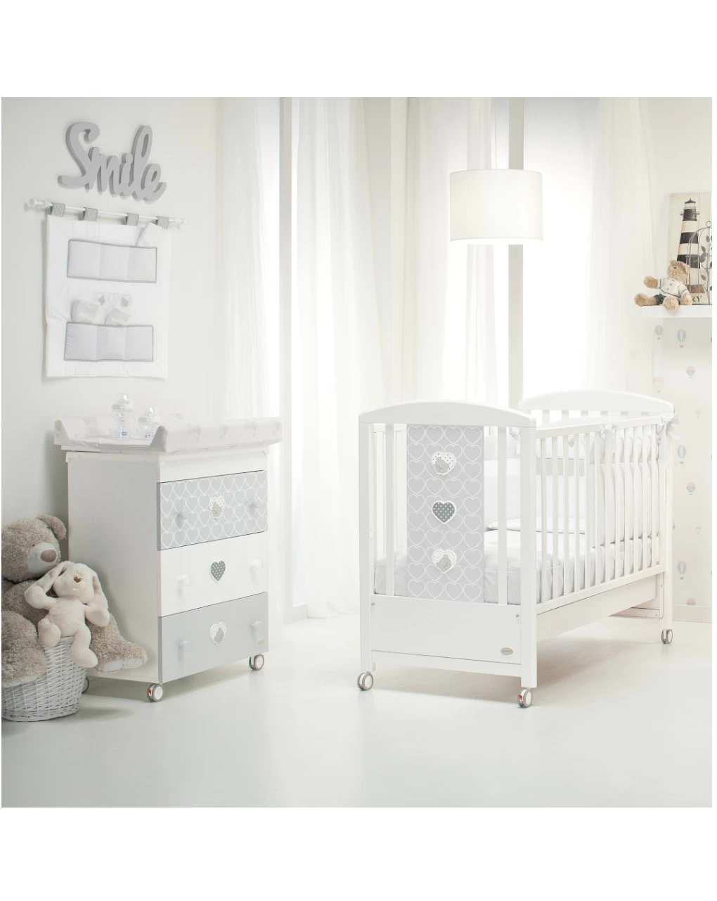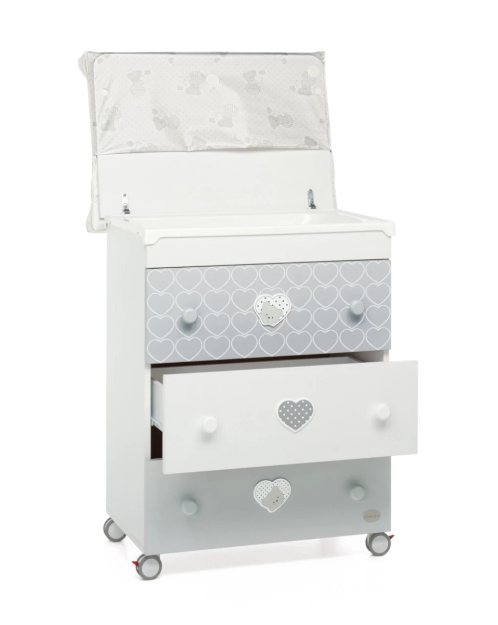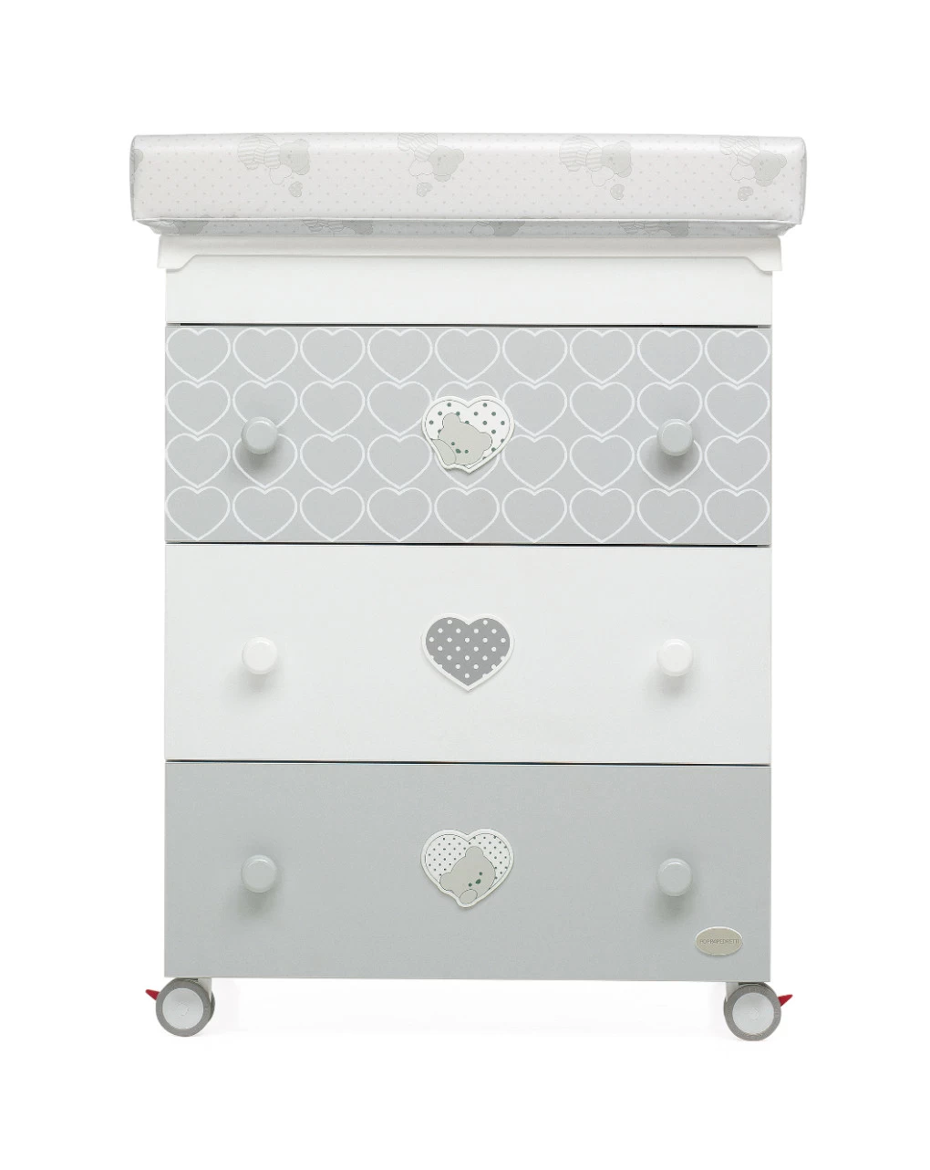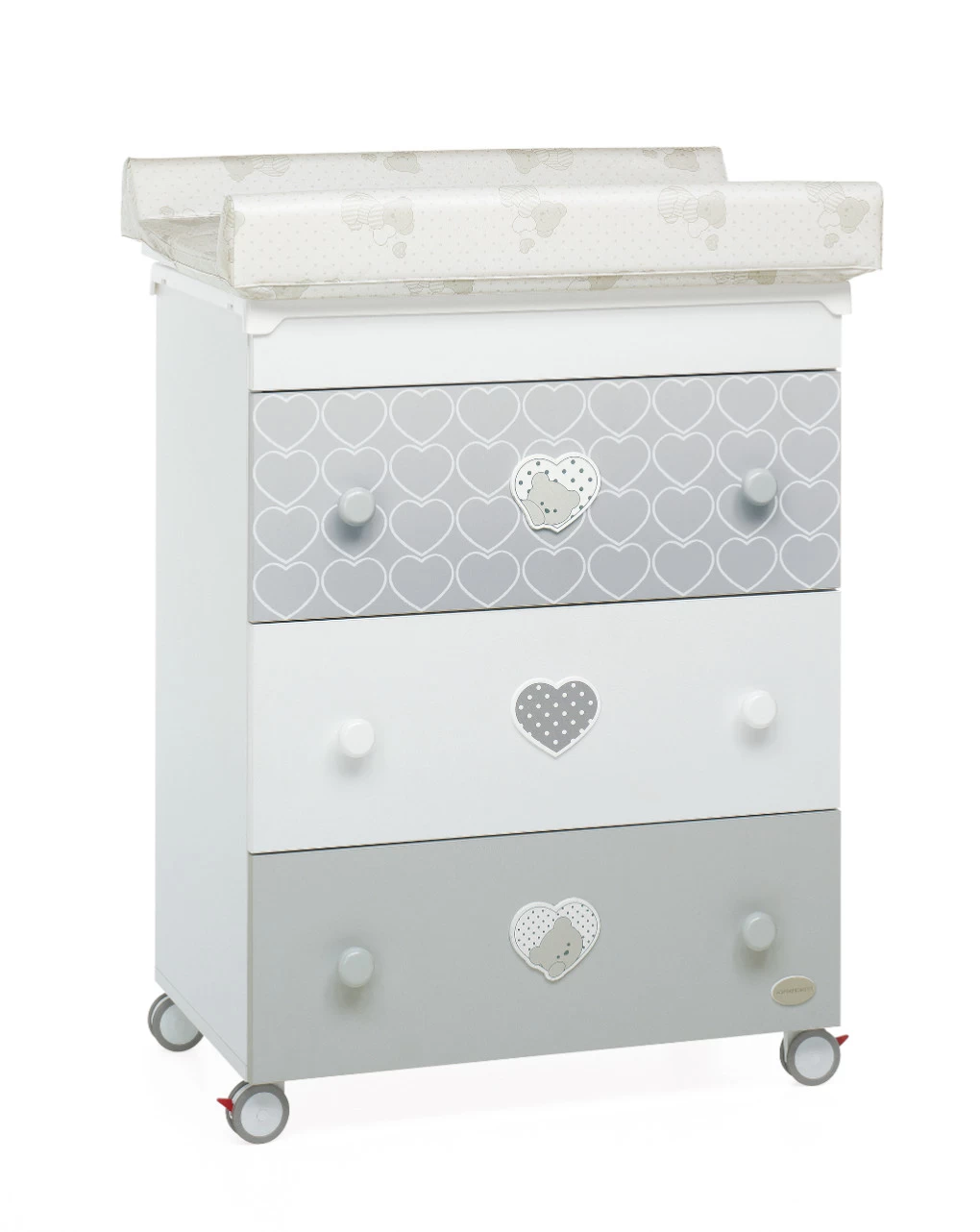 Caratterizzato da tonalità all’insegna del bianco e grigio, sui tre ampi cassetti ha decorazioni con teneri cuori che racchiudono un dolcissimo orsetto. Ha ruote gommate antigraffio, con sistema frenante, per facilitare gli spostamenti.