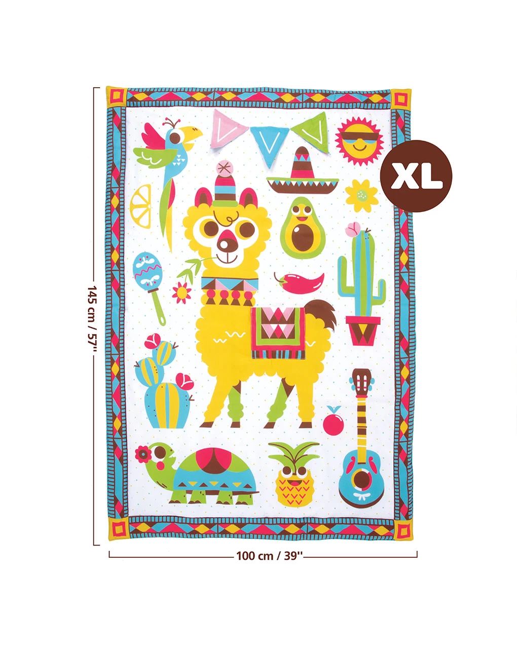 Un tappetone multi attività extra-large (145X100 cm) con imbottitura spessa e morbida. Si piega diventando una borsa con all’interno il tappetone stesso e i giocattoli!