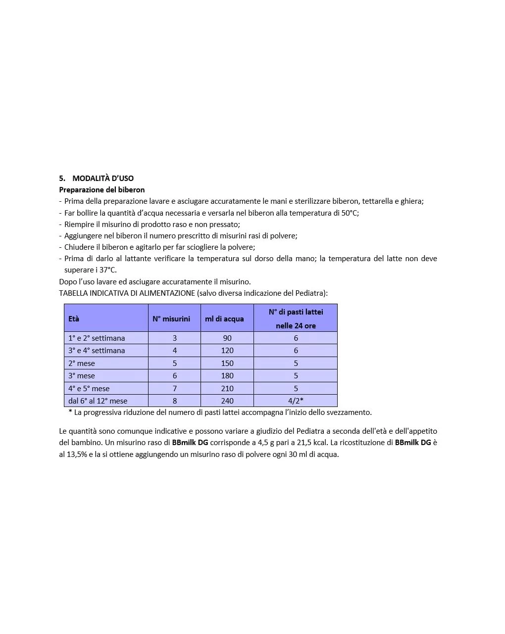BBmilk DG è un alimento a fini medici speciali, adatto come unica fonte di nutrimento alla particolare alimentazione dei lattanti dalla nascita fino al 6° mese di vita, nel caso in cui essi non siano allattati al seno. Dal 6° mese compiuto in poi, e a partire dallo svezzamento, deve essere parte di un’alimentazione diversificata e non può essere utilizzato come unica fonte di nutrimento. L’avvio dello svezzamento deve avvenire unicamente dietro indicazione del Pediatra. BBmilk DG deve essere usato solo sotto controllo del Medico.
