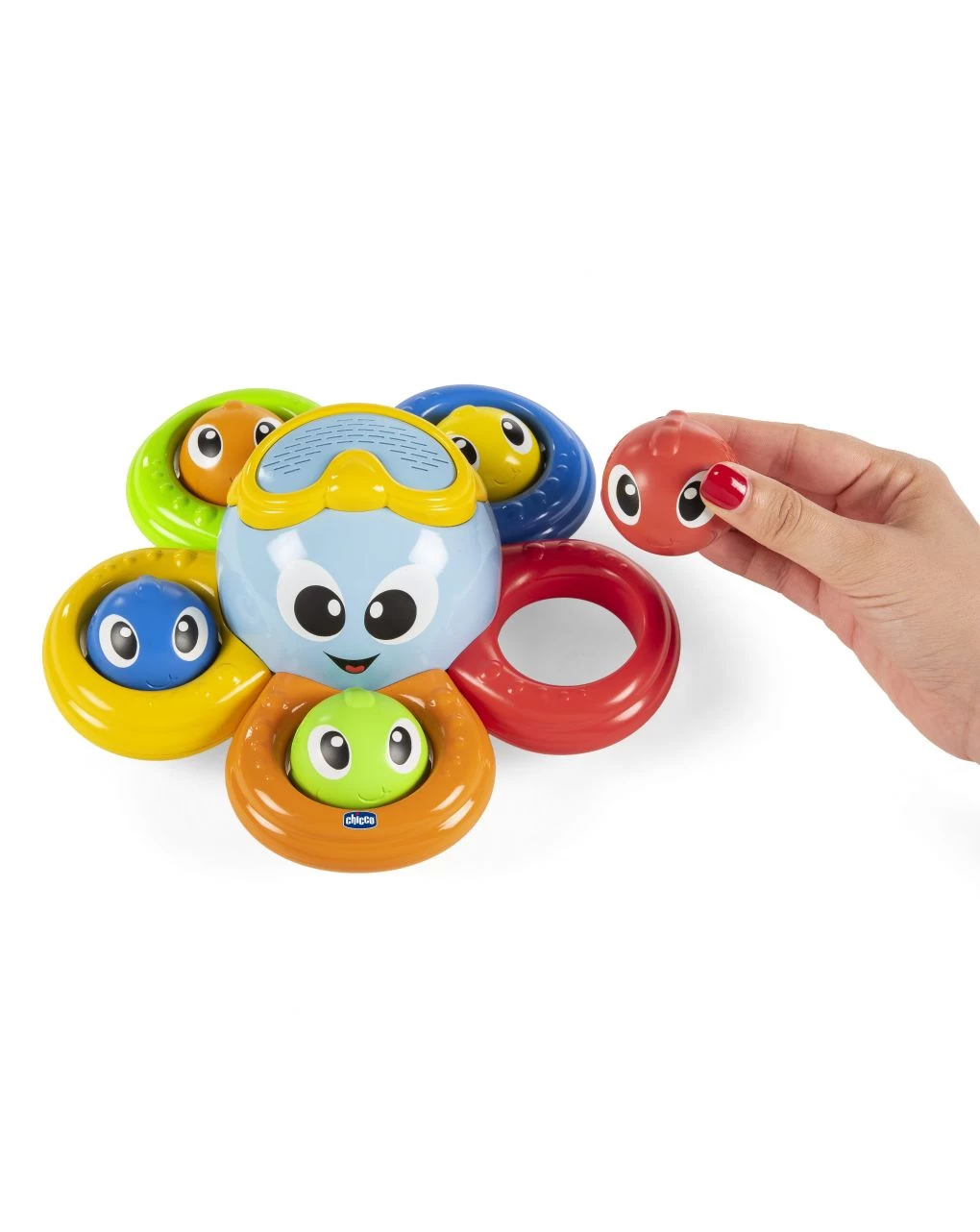 Con Billy il Polpo di Chicco il bagnetto è ancora più divertente. I 5 pesci palla spruzzano acqua e il gioco stimola l’associazione logica, il bambino infatti si può divertire ad inserire ogni pesce nel tentacolo del colore corrispondente. Billy galleggia e, se lo immergi in acqua e lo tiri fuori a testa in giù, crea un fantastico effetto pioggia!
