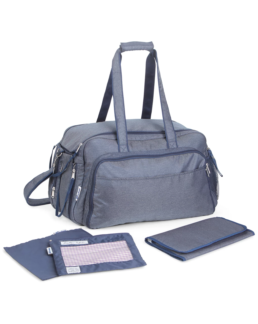 Contiene 2 sacchi biancheria e 5 sacchetti per corredino ospedale con portanome. Tasca scarpe separata, separatore interno amovibile con multitasche.