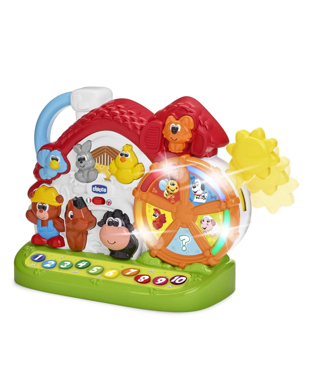La Nuova Fattoria parlante insegna in italiano e in inglese: 10 nomi e versi degli animali della fattoria, 4 curiosità sugli animali, i numeri da 1 a 10, colori e simpatiche canzoni a tema fattoria