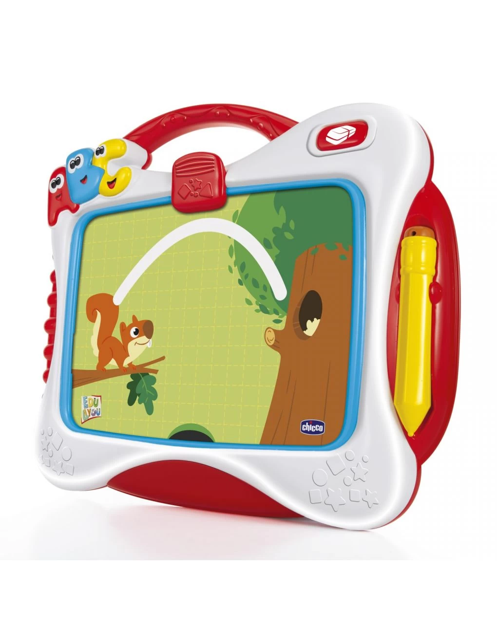 La lavagna allena le abilità di pre-scrittura grazie alle dieci schede incluse che rappresentano percorsi da seguire, lettere e numeri, facilmente applicabili sullo schermo della lavagnatta con la clip blocca-carte. Include 4 modalità di gioco: