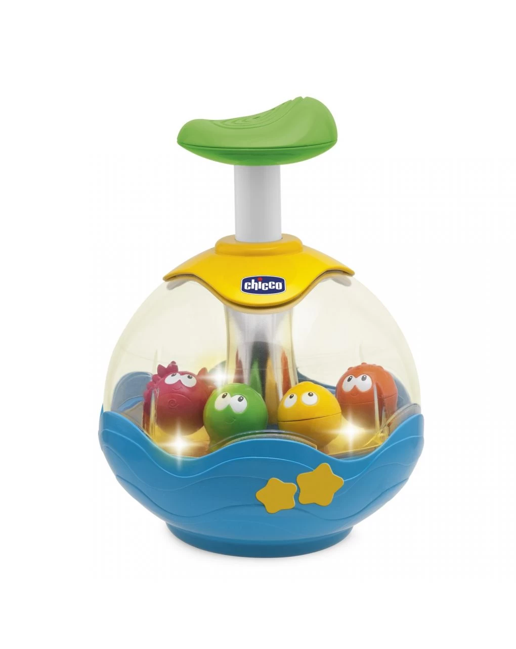 La Trottola Acquario di Chicco è la simpatica trottola elettronica ispirata al mondo marino: facendola ruotare i coloratissimi pesciolini al suo interno nuotano vorticosamente con effetti musicali e luminosi divertenti.Contribuisce a sviluppare la coordinazione e a capire le relazioni causa-effetto.