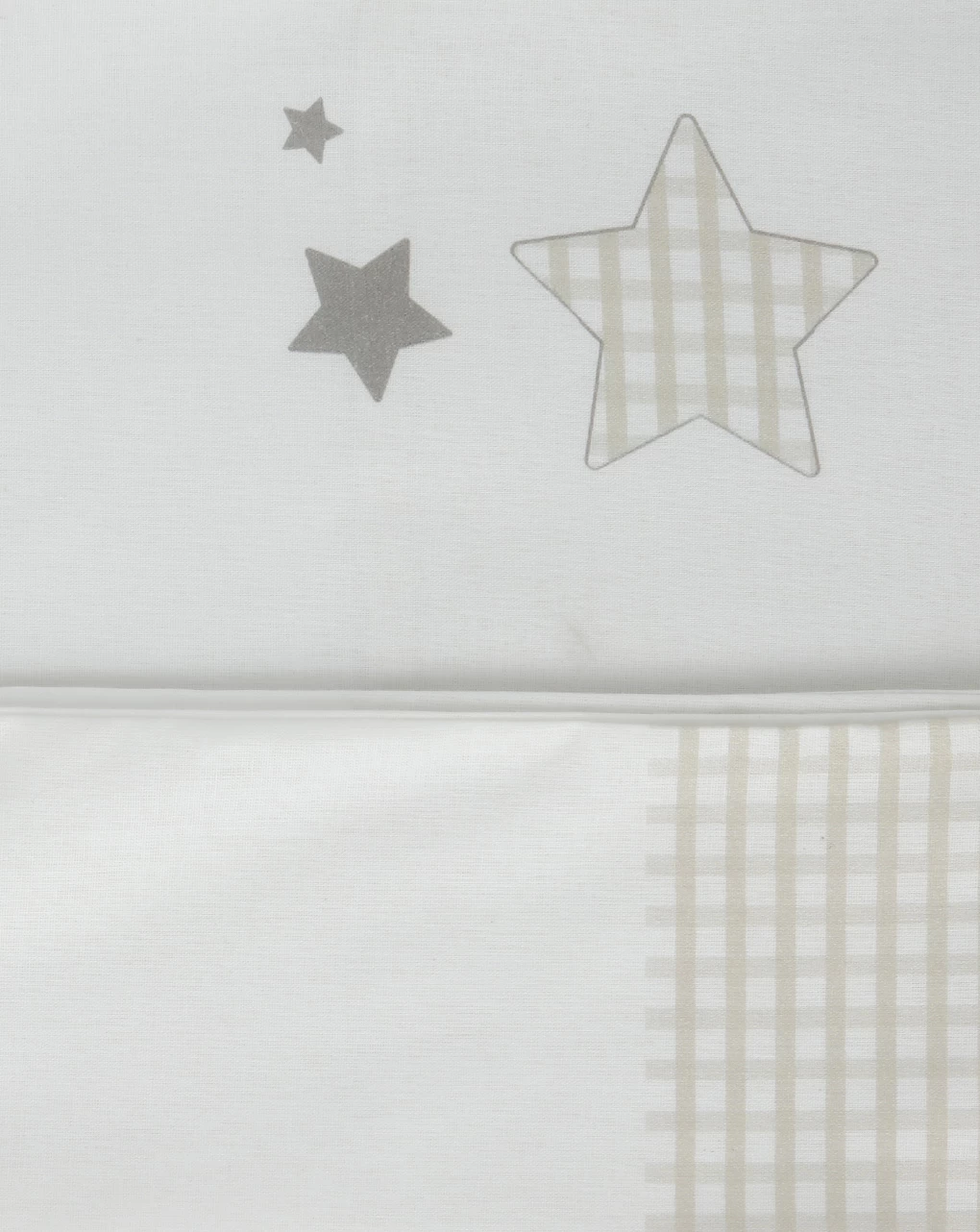 Tenero completino lettino composto da tre pezzi in cotone bianco. Il lenzuolo sopra è decorato dalla stampa di un romantico orsetto seduto sulla luna intento a pescare stelle. Una banda composta da stelle di varie dimensioni lo finisce. La federa è decorata su un lato da una banda a quadri bianchi e beige mentre sul lato opposto ha 3 stelle sempre nei toni del beige.