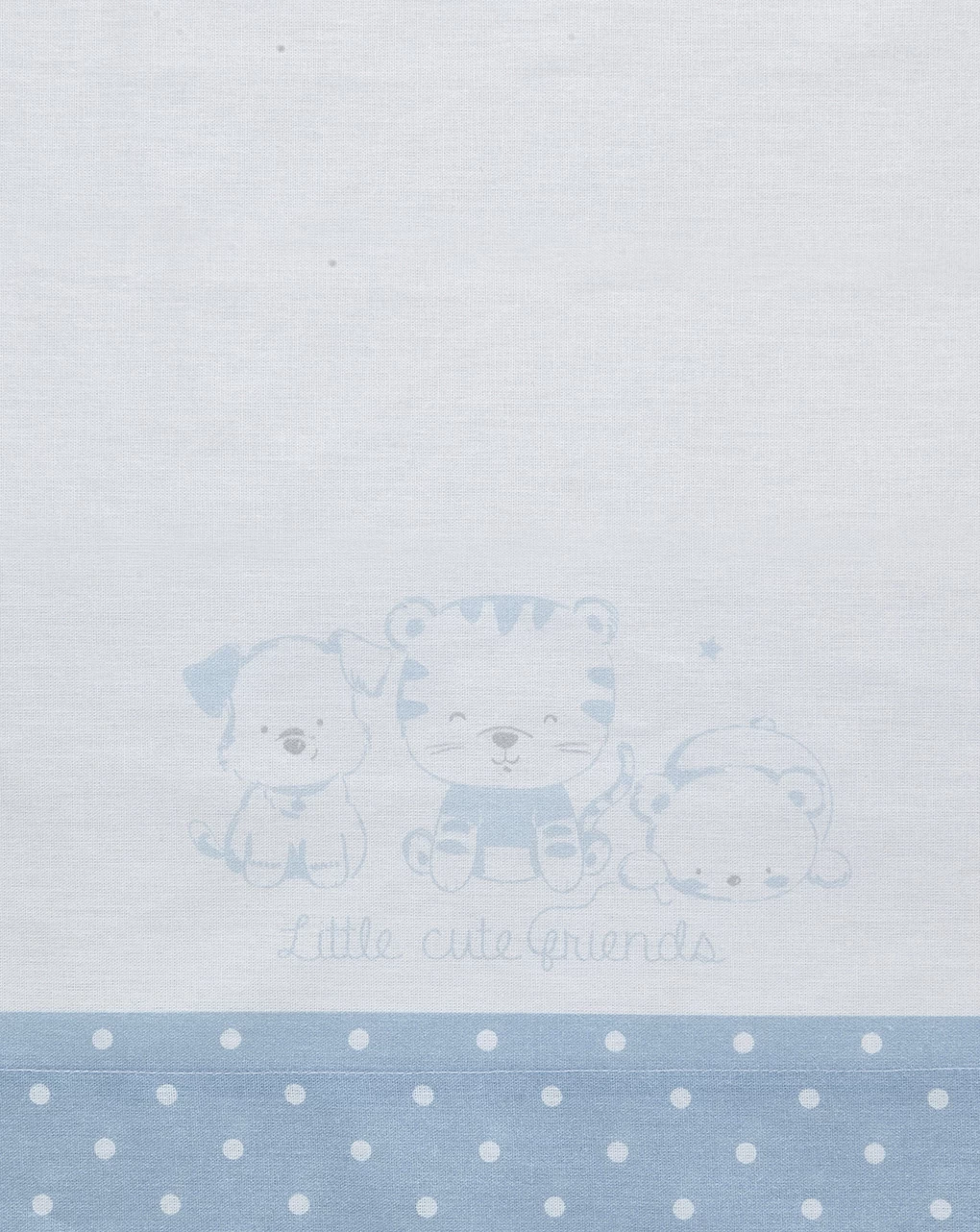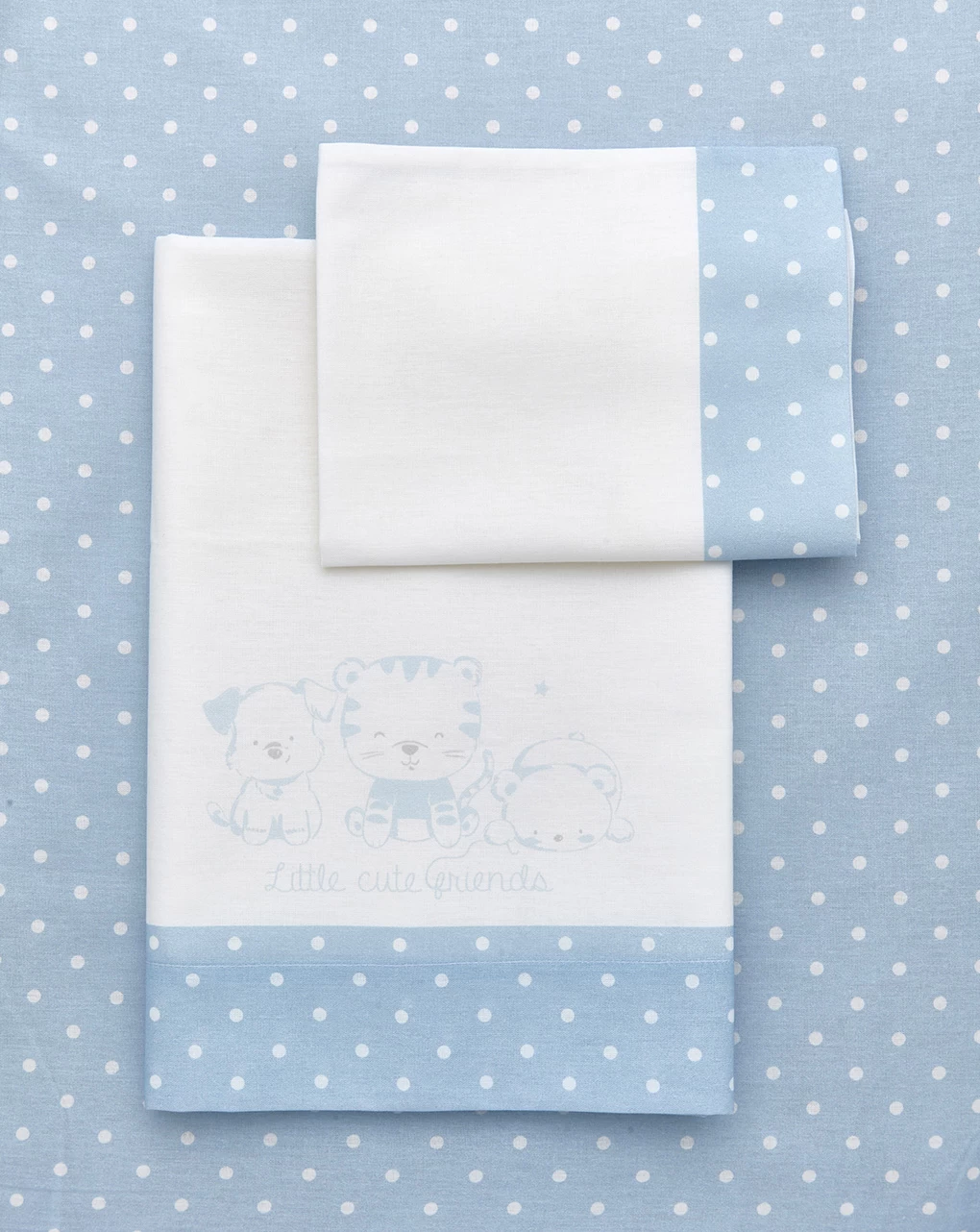 Pratico completo per culla e carrozzina in cotone composto da un lenzuolo sopra con tre simpatici animaletti stampati e bordo con la stampa all-over di piccoli pois bianchi; una federa con bordi stampati in all-over con pois bianchi come il lenzuolo sotto senza angoli. Il set si compone di lenzuolo sotto 80×100 cm, lenzuolo sopra 80×100 cm e federa 26×30 cm.
