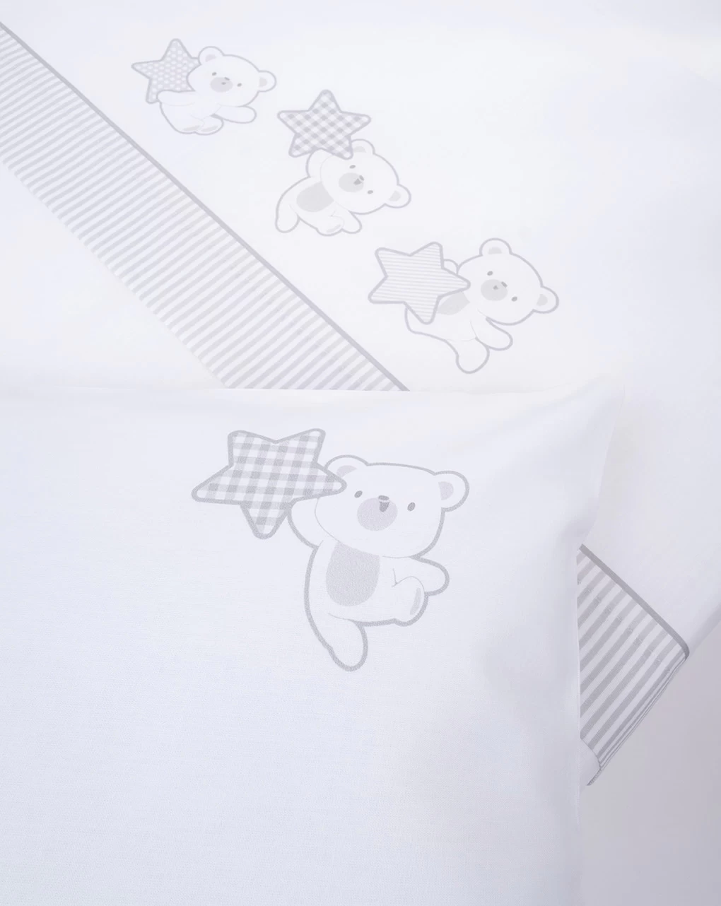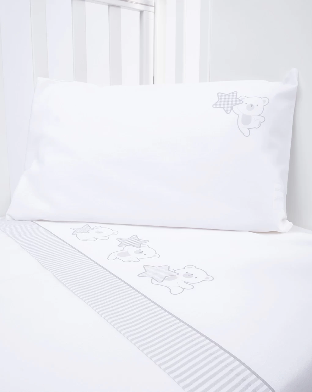 Pratico completo per lettino in cotone composto da un lenzuolo sopra con simpatici orsetti e romantiche stelline stampate in grigio sul fronte.