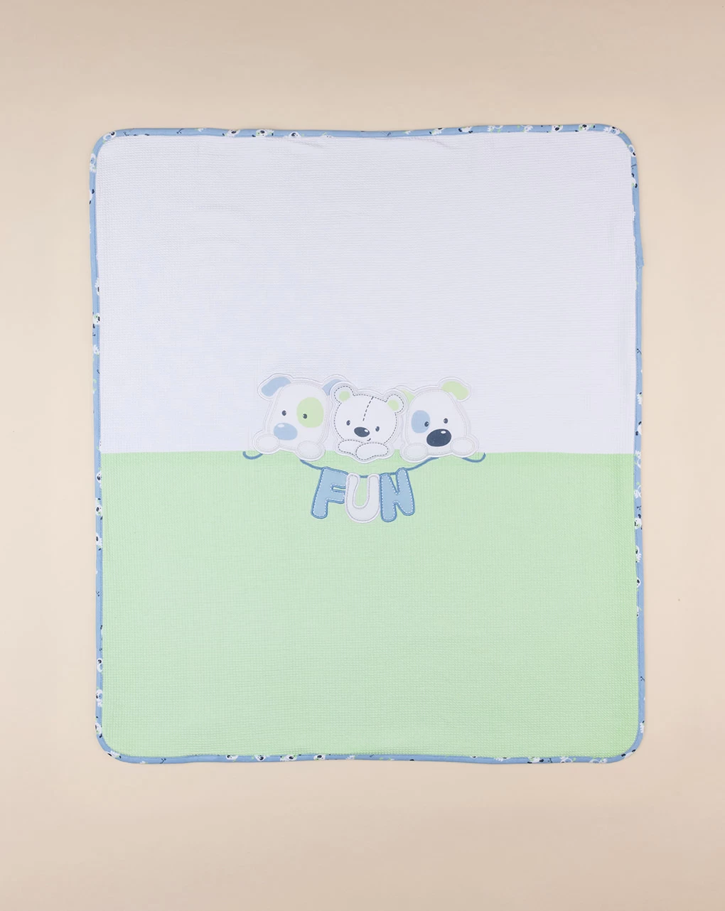 Tenera coperta da culla per neonato. La coperta su sviluppa in color bianco e verde ed è arricchita da immagine centrale a tema cagnolini. Retro decorato in fantasia allover su sfondo bianco. Venduta arrotolata con fiocco come chiusura. Accessori non in vendita. La confezione contiene solo il capo.
