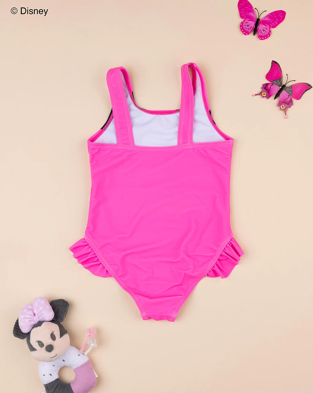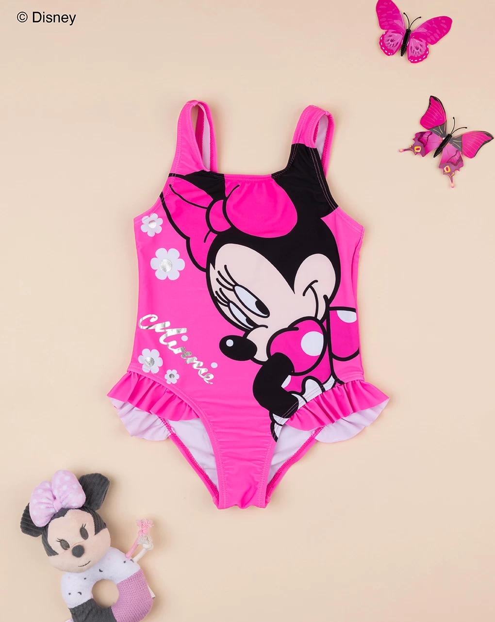 Vivace costume intero da bambina. Il capo si sviluppa prevalentemente su sfondo fucsia e presenta una stampa frontale big size a tema DIsney Minnie. Volant applicati sul girogamba. Accessori non in vendita. La confezione contiene solo il capo d’abbigliamento