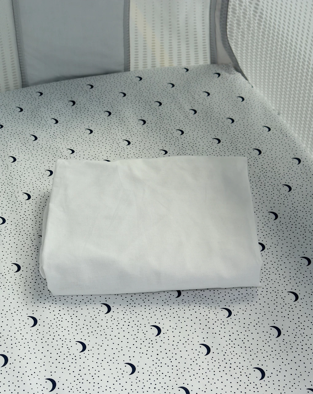 Pratico pack composto da due lenzuola con angoli, Un lenzuolino è in tinta unita bianca mentre l’altro è sempre bianco ma decorato con una stampa allover di piccoli pois e lune di colore blu scuro.