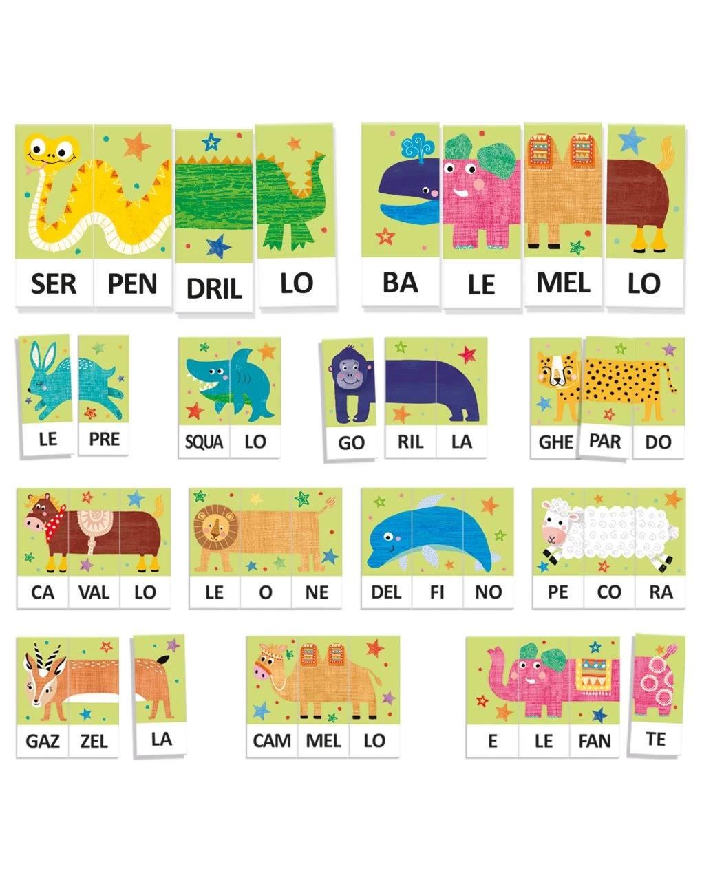 Un gioco originale per imparare a leggere le parole: unisci le sillabe e forma i nomi degli animali illustrati. Inoltre, ricomponendo le sillabe in modo diverso, puoi creare tanti animali fantastici e sviluppare immaginazione e creatività!