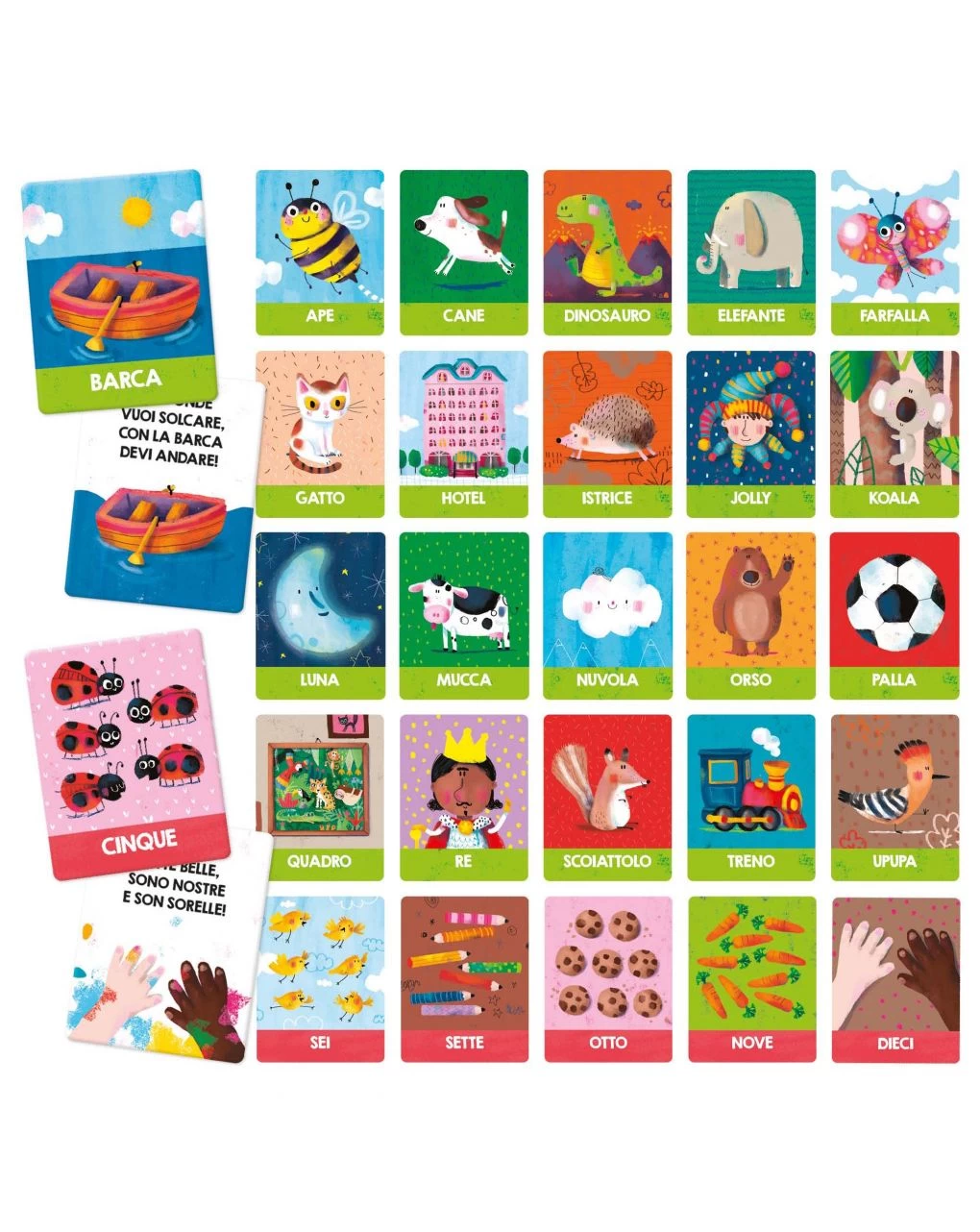 Trentasei grandi carte per svolgere diverse attività progressive che abituano il bambino all’ascolto e al riconoscimento di tantissime parole.