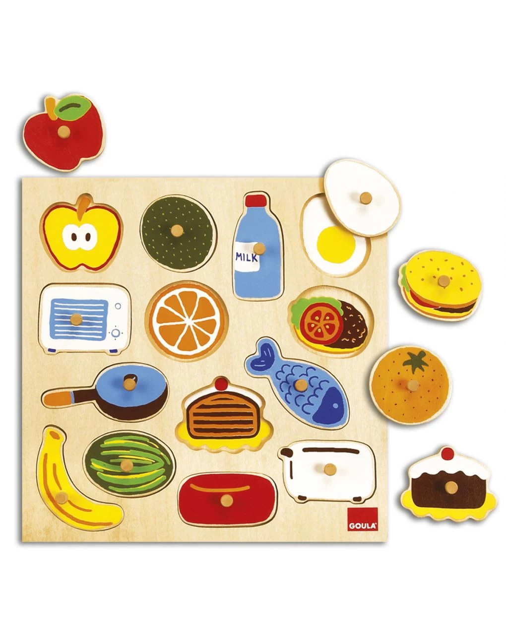 Puzzle da 14 pezzi da incastro raffigurante cibo o oggetti da cucina. Sulla base è illustrato l’interno di questi stessi cibi / oggetti.