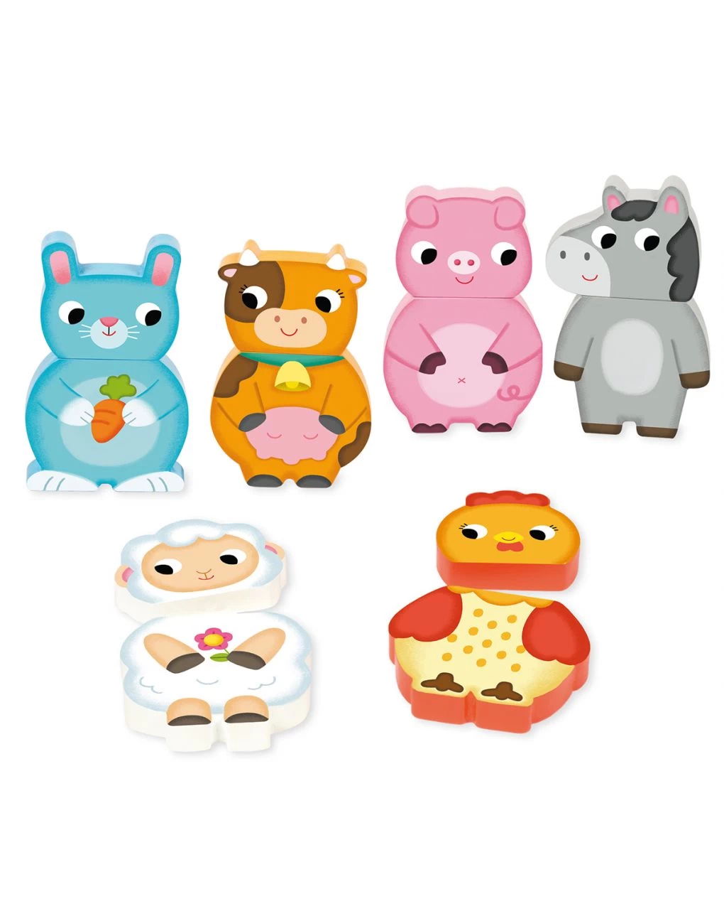 Un puzzle originale in cui il bambino deve ricostruire animali colorati e accattivanti e dove puoi anche creare nuovi animali.