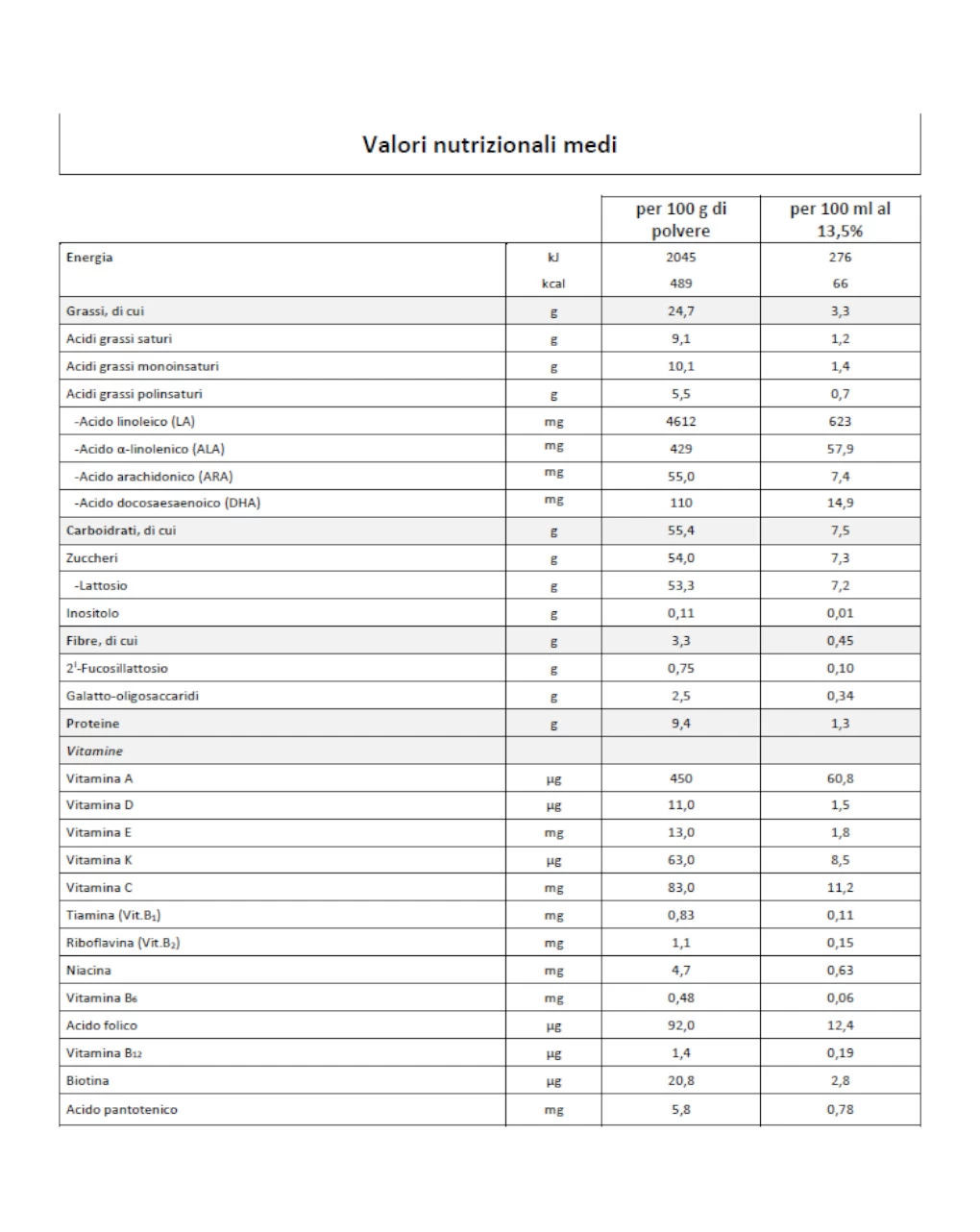 Ricostituzione: 1 misurino raso e non pressato ogni 30 ml di acqua, meglio se minimamente mineralizzata come Humana Amorosa. Humana 1 si ricostituisce al 13,5%. Il misurino raso contiene circa 4,5 g di polvere.