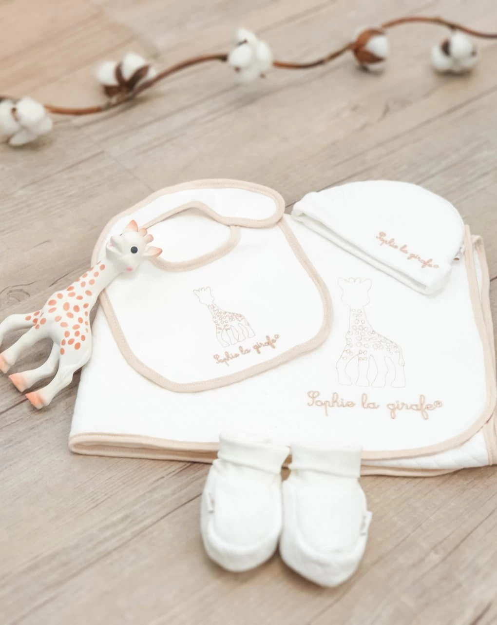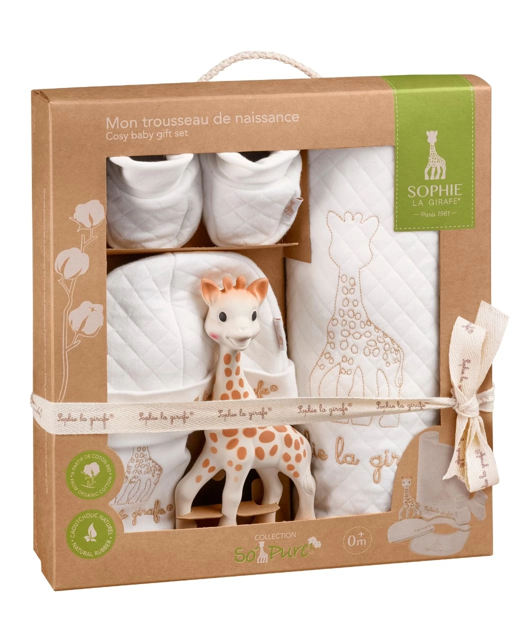 Si compone di: Sophie la girafe, une copertina trapuntata (75x100cm), un bavaglino, un berretto e delle scarpine. In cotone 100% biologico.