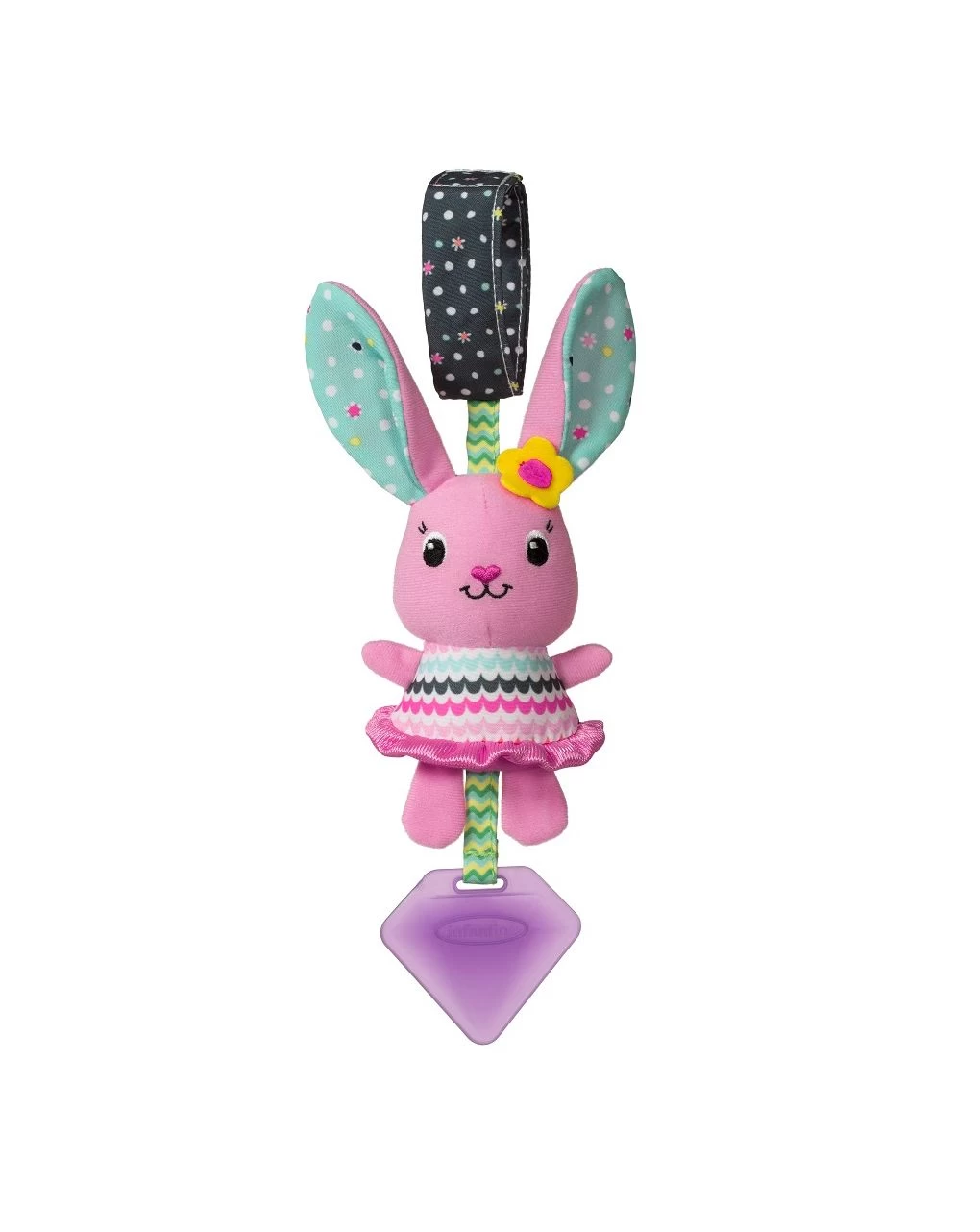 Un divertente coniglietto da portare sempre con sé. Grazie al cinturino sulla testa, con chiusura a strappo, puoi appenderlo comodamente alla palestrina, al passeggino o alla carrozzina per far divertire il tuo bambino! L’accessorio in gomma può essere facilmente afferrato dal tuo bambino ed è ideale per aiutarlo durante la fase della dentizione. Muovilo per sentire i rumori. Ideale per stimolare la curiosità del tuo bambino.