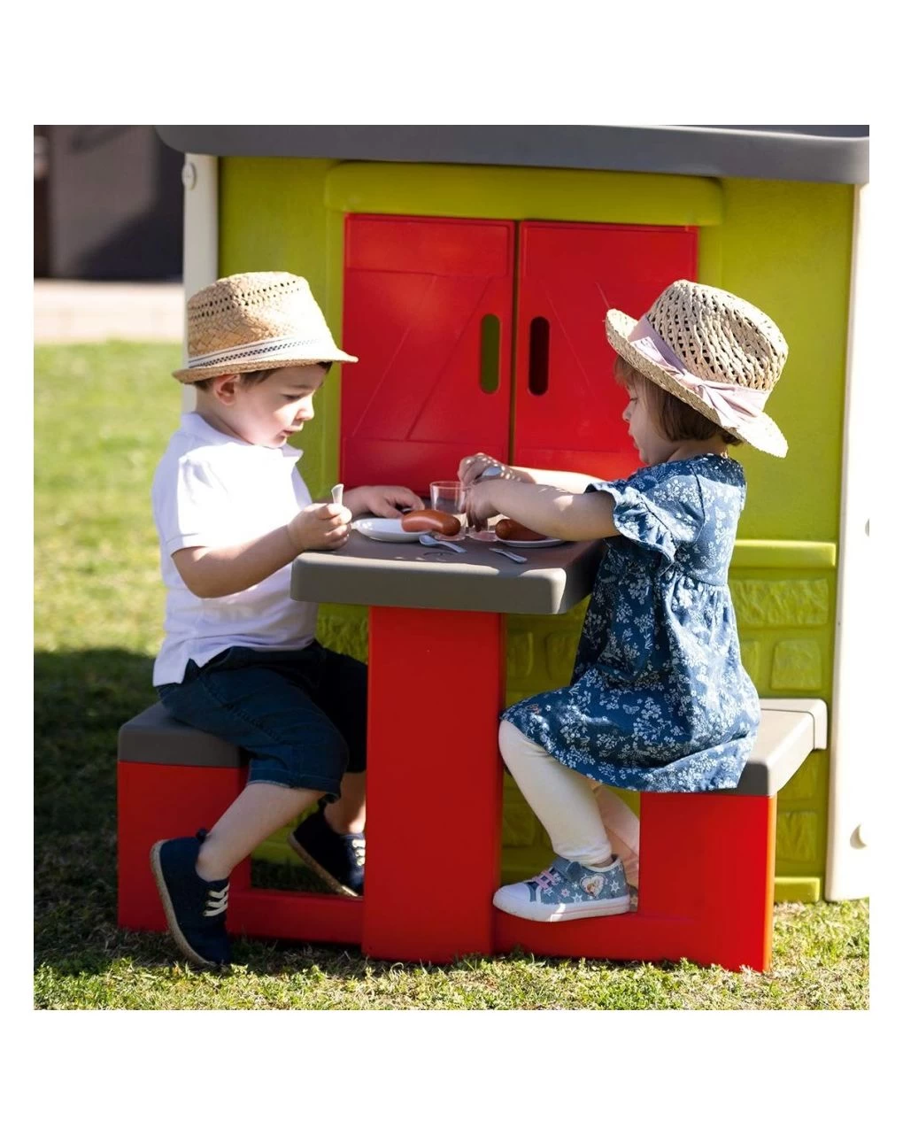 Tavolo pic nic con panche per la le Casetta Jura Lodge New, Casetta My Neo House e Casetta Chef House. Trattamento anti-UV per garantire la durata dei colori nel tempo.