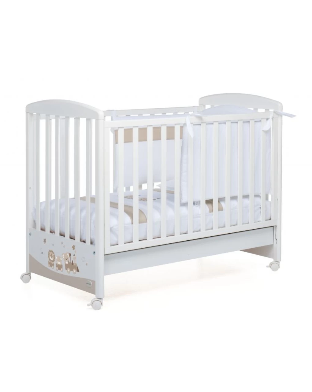 Il lettino in legno Happytour di Foppapedretti ha una sponda regolabile a due altezze, per facilitare il riordino del lettino, e rete a doghe. La testata è decorata con un simpatico trenino con animaletti a bordo. Il lettino ha un ampio cassetto inferiore, suddiviso in due scomparti, e ruote piroettanti, con sistema frenante, per facilitare gli spostamenti. La struttura solida e durevole nel tempo è verniciata con vernici atossiche ed è 100% made in Italy.