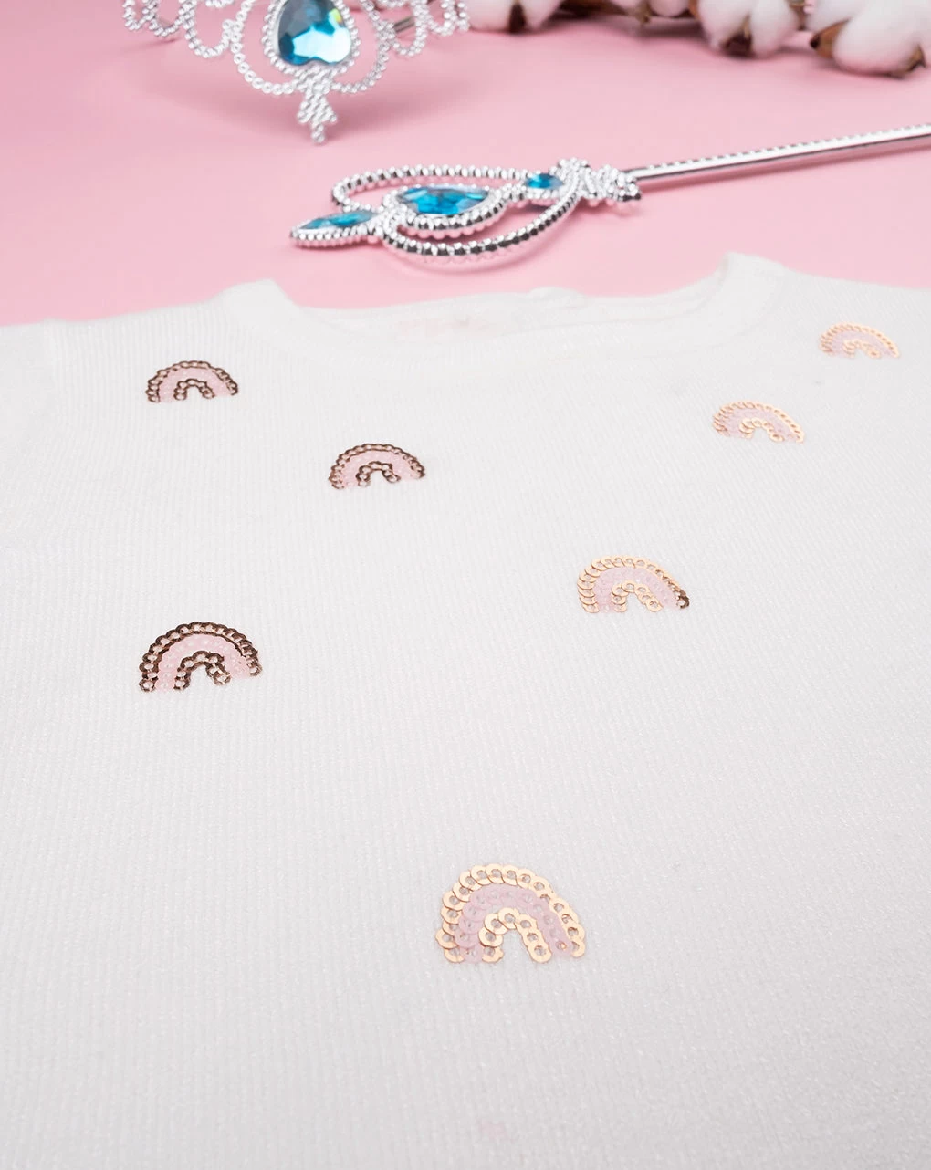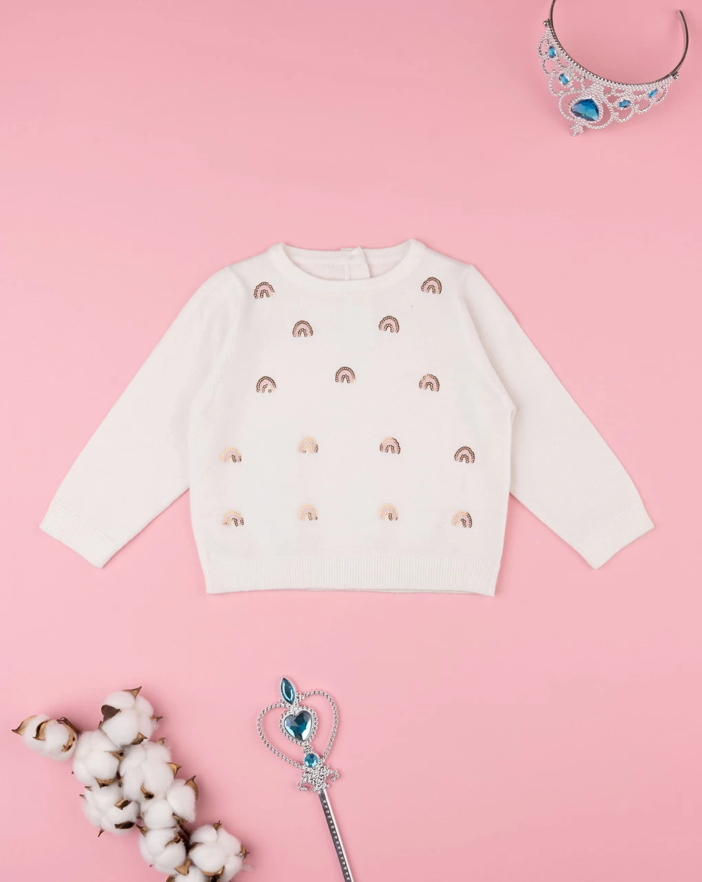 Tenera maglia tricot da bambina. Il capo si sviluppa su sfondo panna e presenta paillettes a forma di piccoli arcobaleni in tinta rosata e dorata. La vestibilità è morbida e pratica grazie a bottoni automatici sul retro. La maglia tricot da bambina è adatta per occasioni casual e facilmente abbinabile. Accessori non in vendita. La confezione contiene solo il capo d’abbigliamento