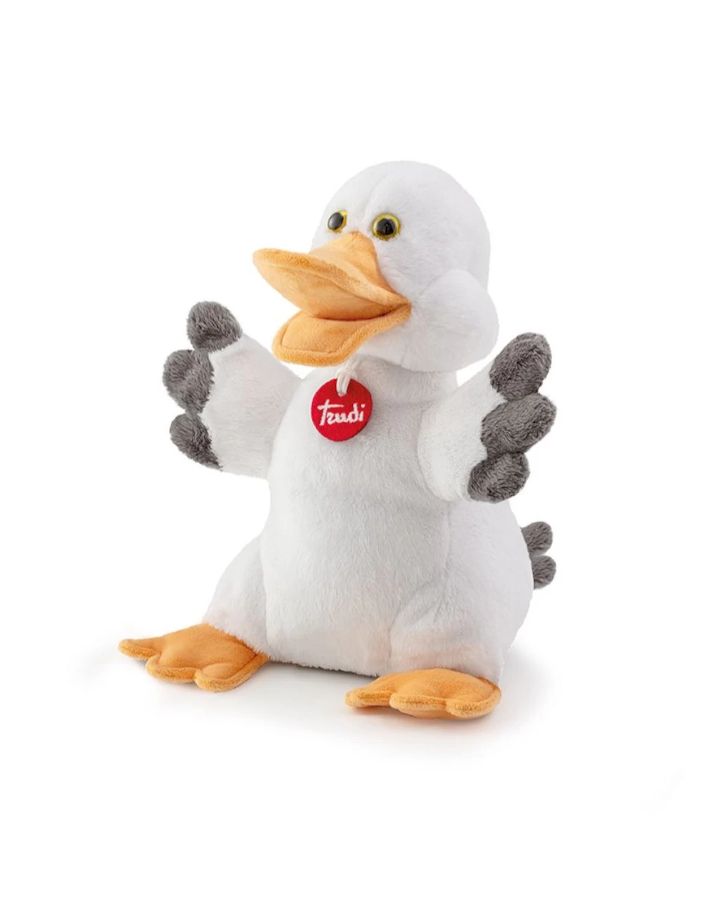 Simpatica marionetta papera Trudi per piccoli e grandi, indicata fin dalla nascita. Super morbida, la marionetta può rivelarsi anche un tenero peluche, lavabile in lavatrice a 30° o a mano, utilizzando una spugna e sapone neutro.