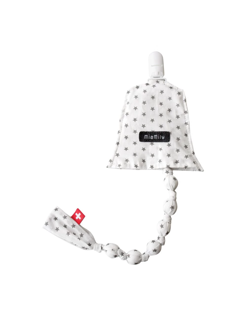 DESIGN MULTIFUNZIONALE: La clip per ciuccio 4 in 1 MiaMily è stata realizzata con perline in silicone, una copertura per ciuccio incorporata e materiale speciale che emette un rumore divertente che i bambini adorano.