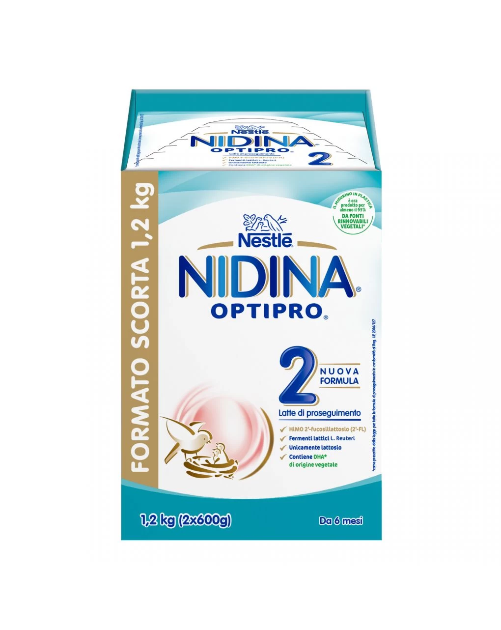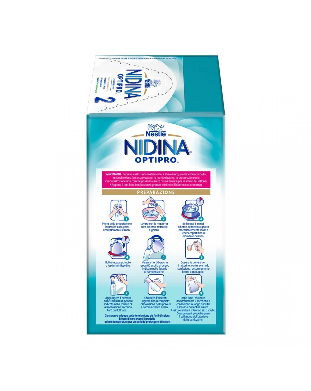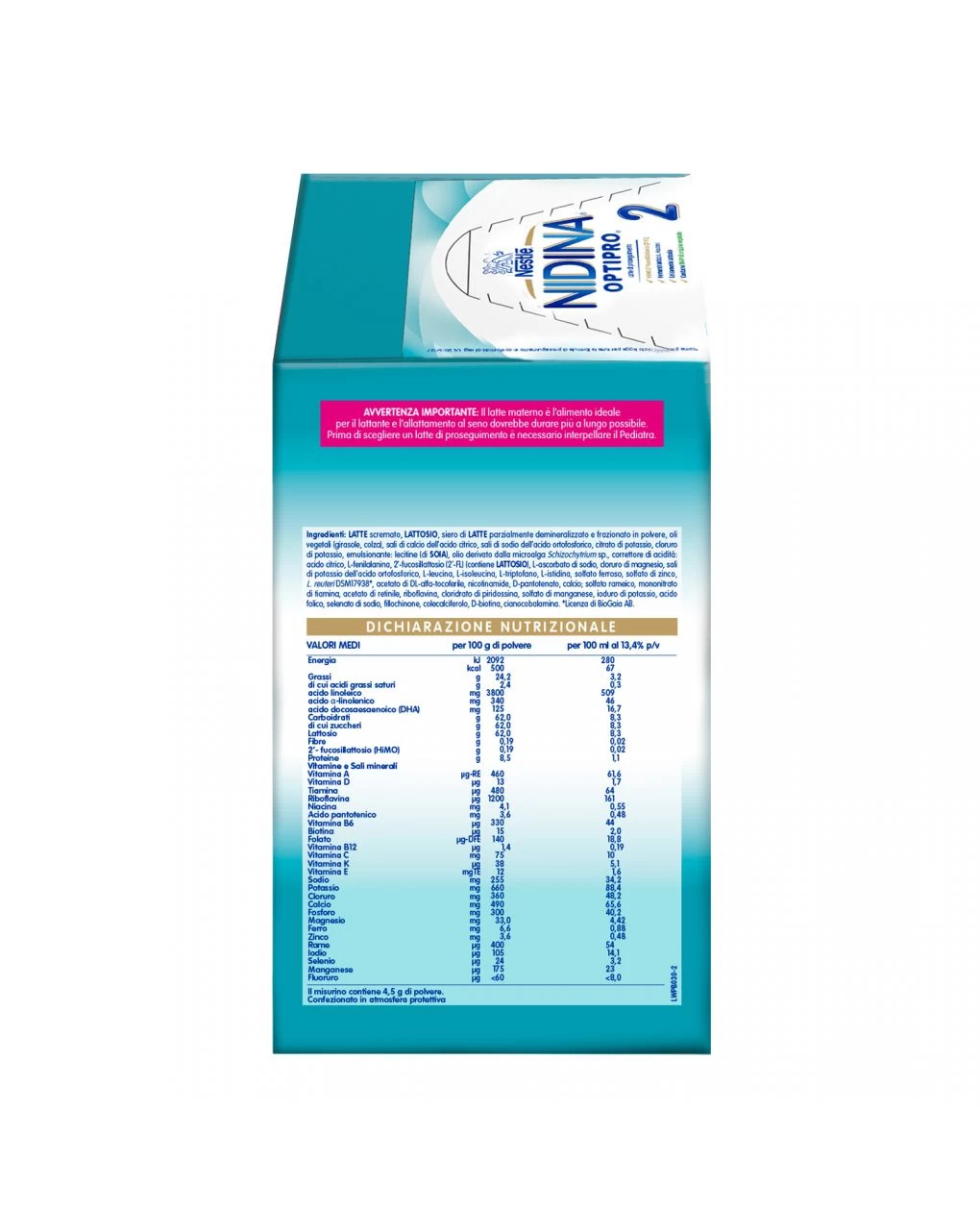 NESTLÉ NIDINA OPTIPRO 2 è un latte di proseguimento in polvere indicato per l’alimentazione del lattante a partire da 6 mesi di vita. È formulato per far parte di una alimentazione diversificata, da iniziare secondo le indicazioni del Pediatra. Non deve essere utilizzato in sostituzione del latte materno nei primi 6 mesi di vita.