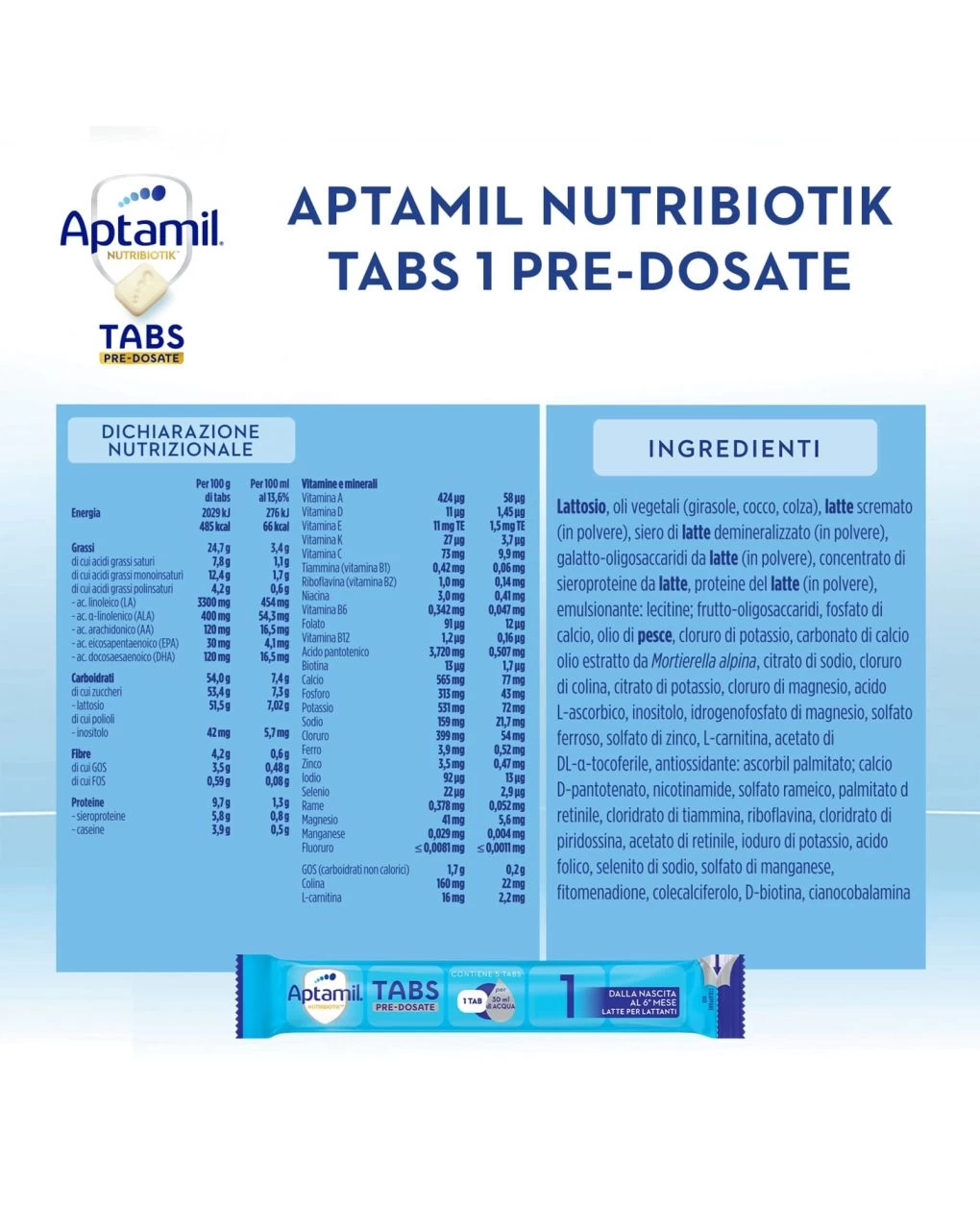 AVVERTENZE IMPORTANTI: Il latte materno è l’alimento ideale per il lattante e dovrebbe essere favorito e utilizzato fino a quando è possibile. Se manca si può passare all’uso di un latte per lattanti solo dietro consiglio del Pediatra. APTAMIL NUTRIBIOTIK TABS 1 PRE-DOSATE è idoneo per i lattanti sin dalla nascita quando non sono allattati al seno.