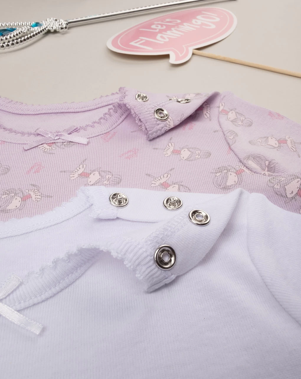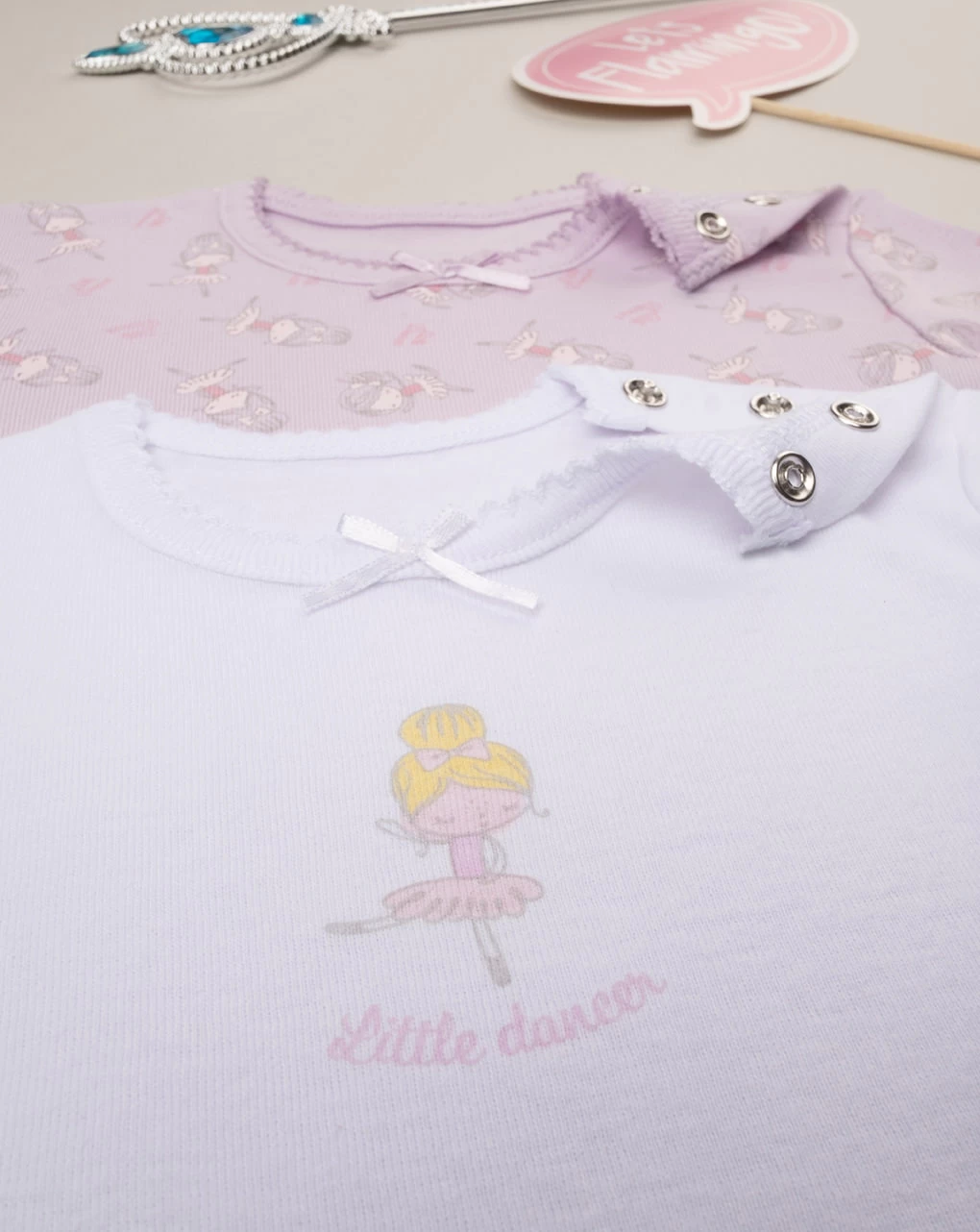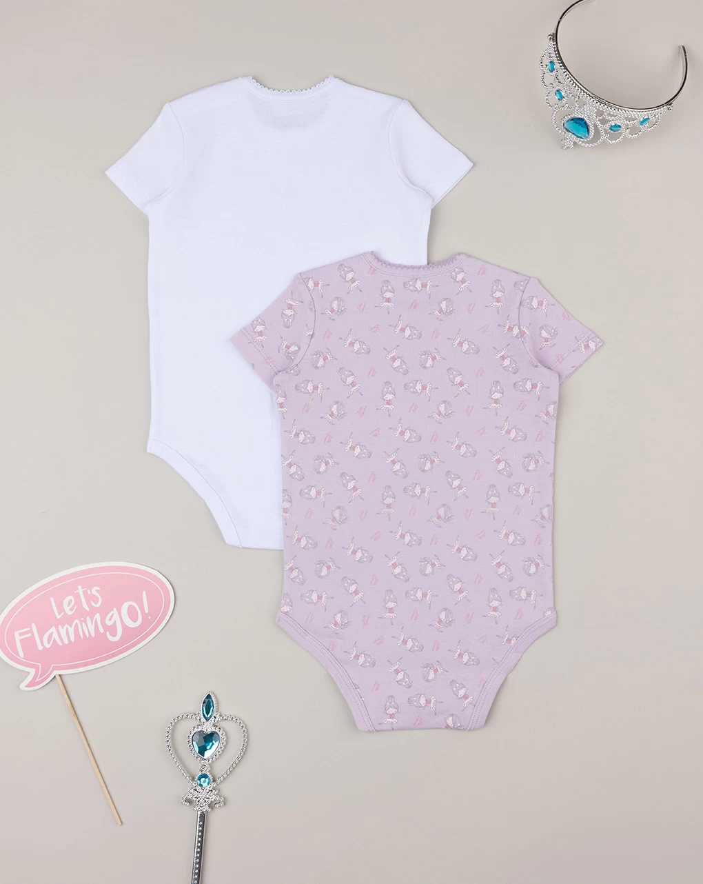 Tenero pack 2 body da bambina oekotex. I capo si presentano a maniche corte su sfondo lilla e bianco con stampa ballerine in tinta coordinata. La vestibilità è morbida e pratica grazie a bottoni automatici sul cavallo. Il capo è in cotone oeko – tex, testato per sostanze nocive garantisce alta sicurezza. Accessori non in vendita. La confezione contiene solo il capo d’abbigliamento