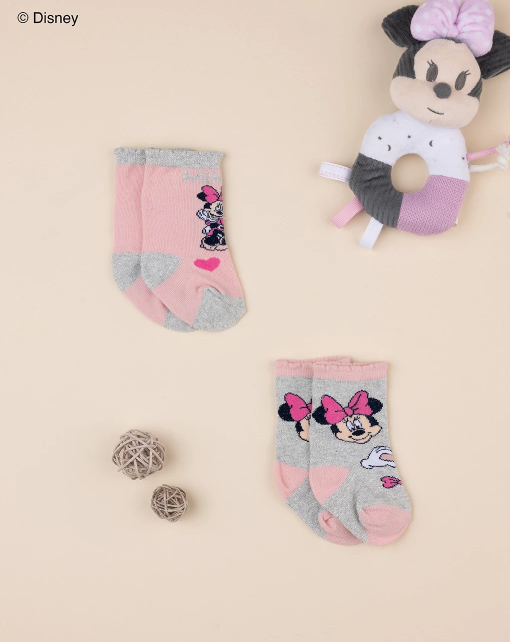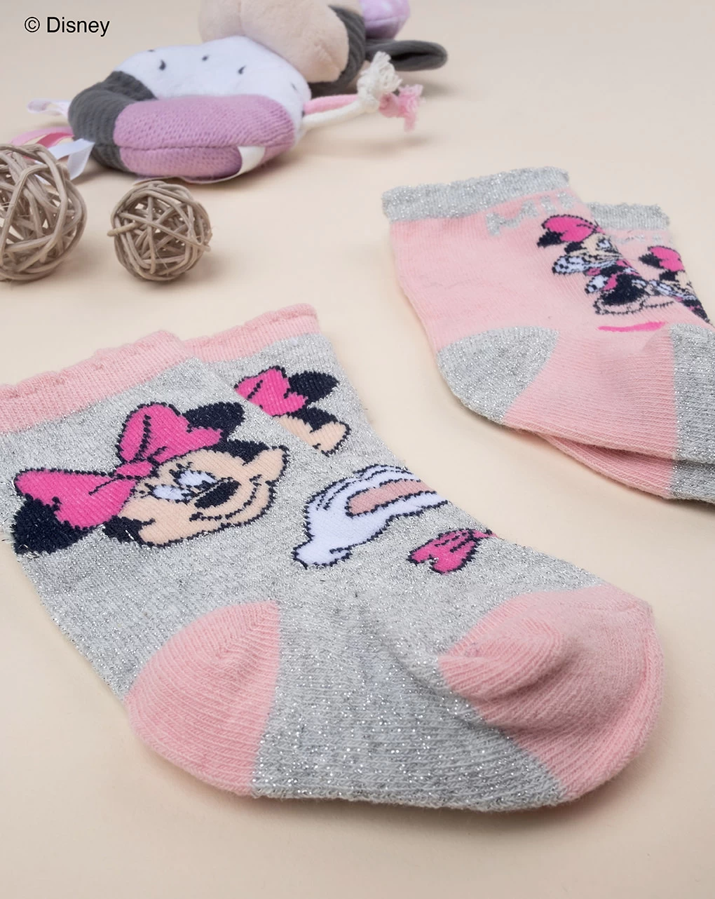 Pack 2 calzine da bambina a tema Disney. Calze corte nei toni del rosa e del grigio decorate con ricamo frontale a tema Disney Minnie. Modello elastico e confortevole. Accessori non in vendita. La confezione contiene solo il capo di abbigliamento.