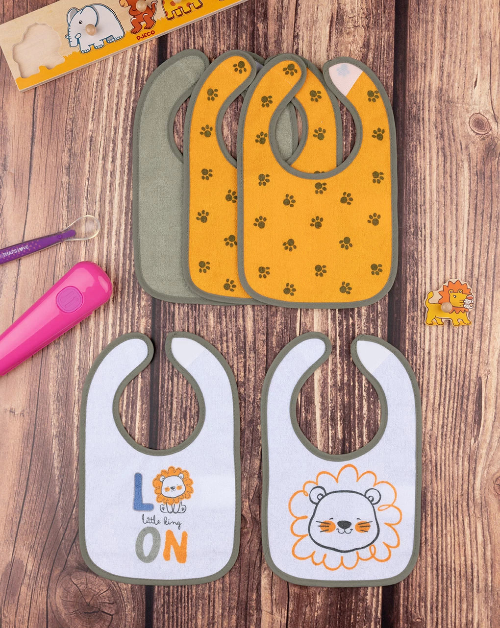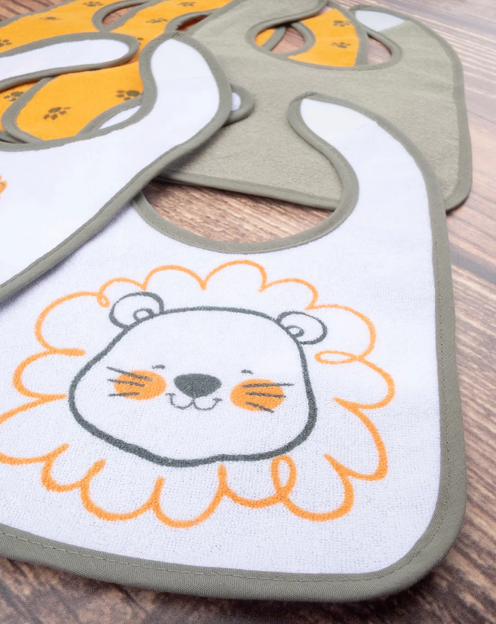 Simpatico pack 5 bavaglini piccoli in spugna da bambino in 100% cotone. I capi si sviluppano in varie tonalità quali bianco, giallo ocra e verde militare e con differenti e stilizzate stampe “Leone” in tinta coordinata. La vestizione è pratica e sicura grazie a bottone automatico sul girocollo. Accessori non in vendita. La confezione contiene solo il capo d’abbigliamento