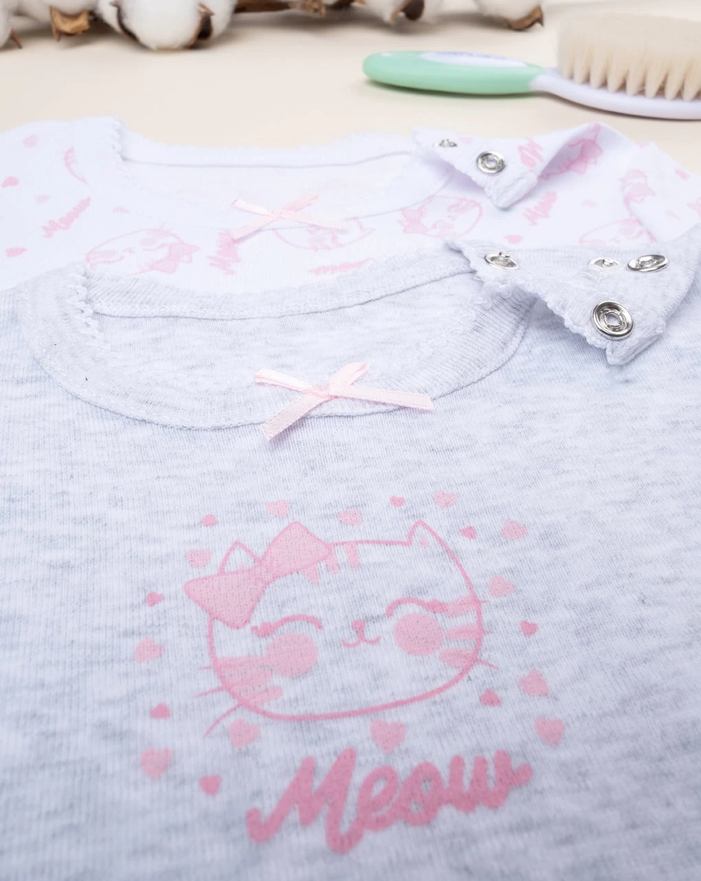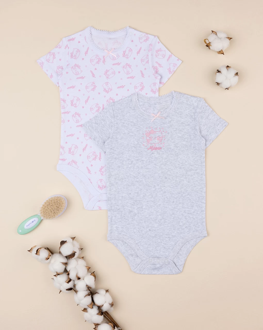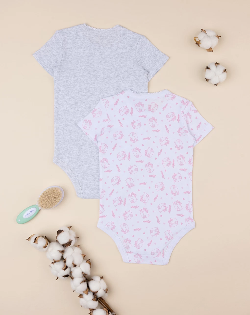 Pack 2 body intimi da bimba. Questi bodi a maniche corte sono perfetti per essere usati sotto qualsiasi tipo di outfit. Il primo capo si sviluppa su sfondo bianco ed è decorato con una fantasia a micro fiorellini rosa allover. Il secondo è un body grigio tnta unita arricchito da una stampa frontale. Entrambi i capi hanno una chiusura con pratici bottoncini a pressione al patello. Accessori non in vendita. La confezione contiene solo i capi di abbigliamento.