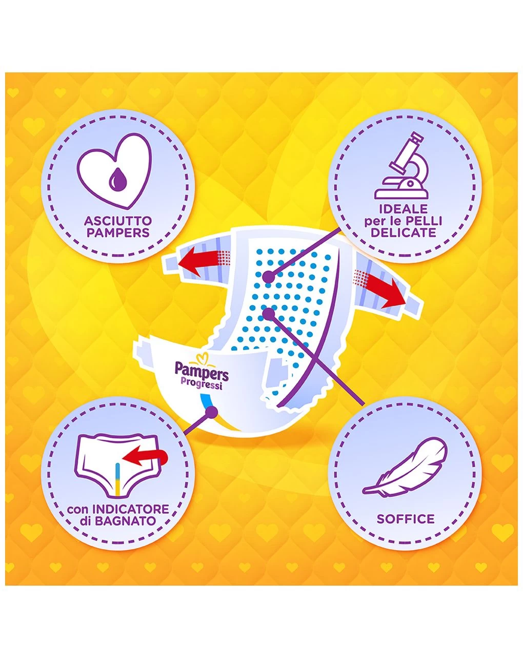 Pampers Progressi è la linea Pampers studiata per coccolare e tenere asciutta la pelle del tuo bimbo in ogni fase della crescita. «Nasce» è un pannolino esclusivo, pensato appositamente per i primi mesi di vita dei bimbi quando la loro pappa è liquida. I pannolini Pampers Progressi sono dotati di uno speciale filtro a fori larghi che cattura e assorbe la pupù liquida dei neonati, prevenendo le irritazioni della pelle.