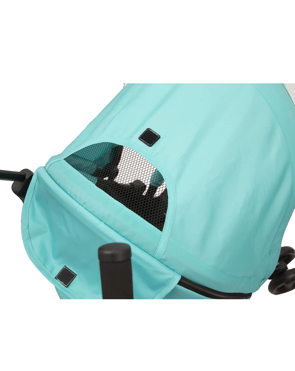 - Dotato di 4 doppie ruote, le anteriori piroettanti, freno gemellato sulle ruote posteriori e capote con finestra.