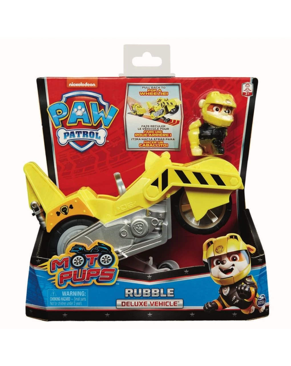 I cuccioli Paw Patrol nei loro veicoli a tema Moto Pups come nella serie TV. il veicolo di Rubble è dotato di un motore a frizione, basta tirare indietro in veicolo per farlo correre in avanti e attivare la trasformazione: una 3 ruota appare dal basso per permettere al veicolo di compiere vari stunt.