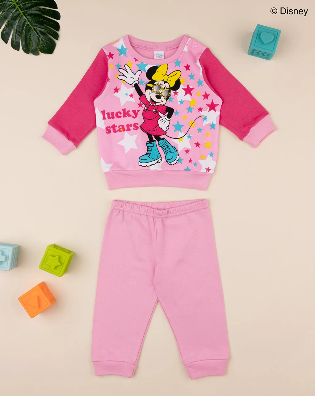 Tenero pigiama due pezzi da bambina. Il capo si compone di maglia rosa a maniche lunghe fucsia con stampa allover a tema Disney Minnie. Polsini e girocollo rosa tinta unita. Pantalone in total rosa con elastico in girovita che consente una vestibilità regolabile. Accessori non in vendita. La confezione contiene solo il capo d’abbigliamento