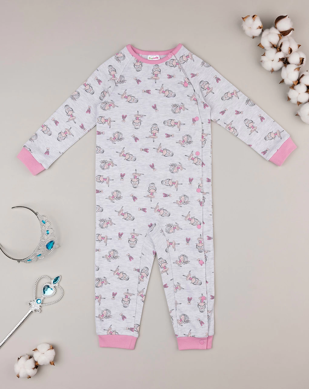 Tenero pigiamone da bambina. Il capo si presenta in un pezzo unico su sfondo grigio chiaro con bordature in rosa intenso e con stampa allover “Ballerine” in tonalità coordinata; la vestibilità è morbida e pratica grazie a bottoni automatici sul retro e sul cavallo. Accessori non in vendita. La confezione contiene solo il capo d’abbigliamento
