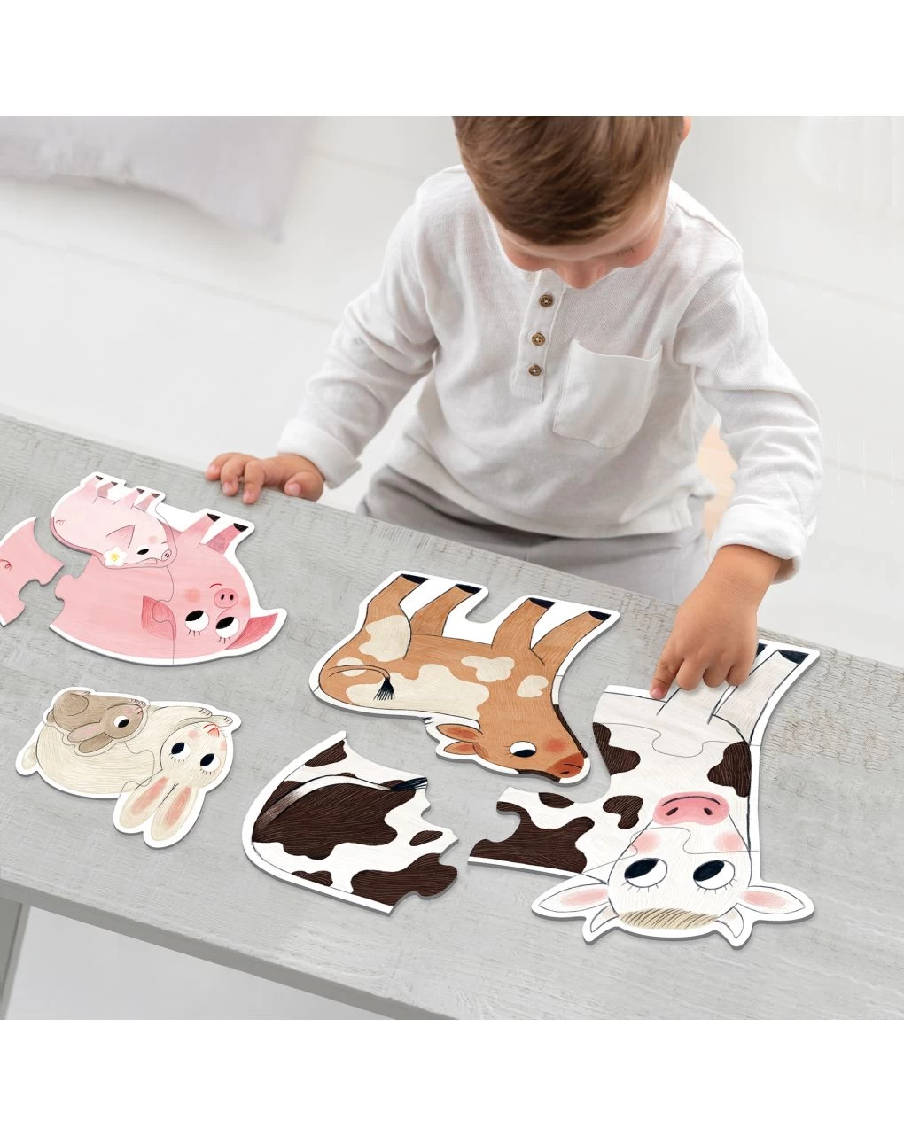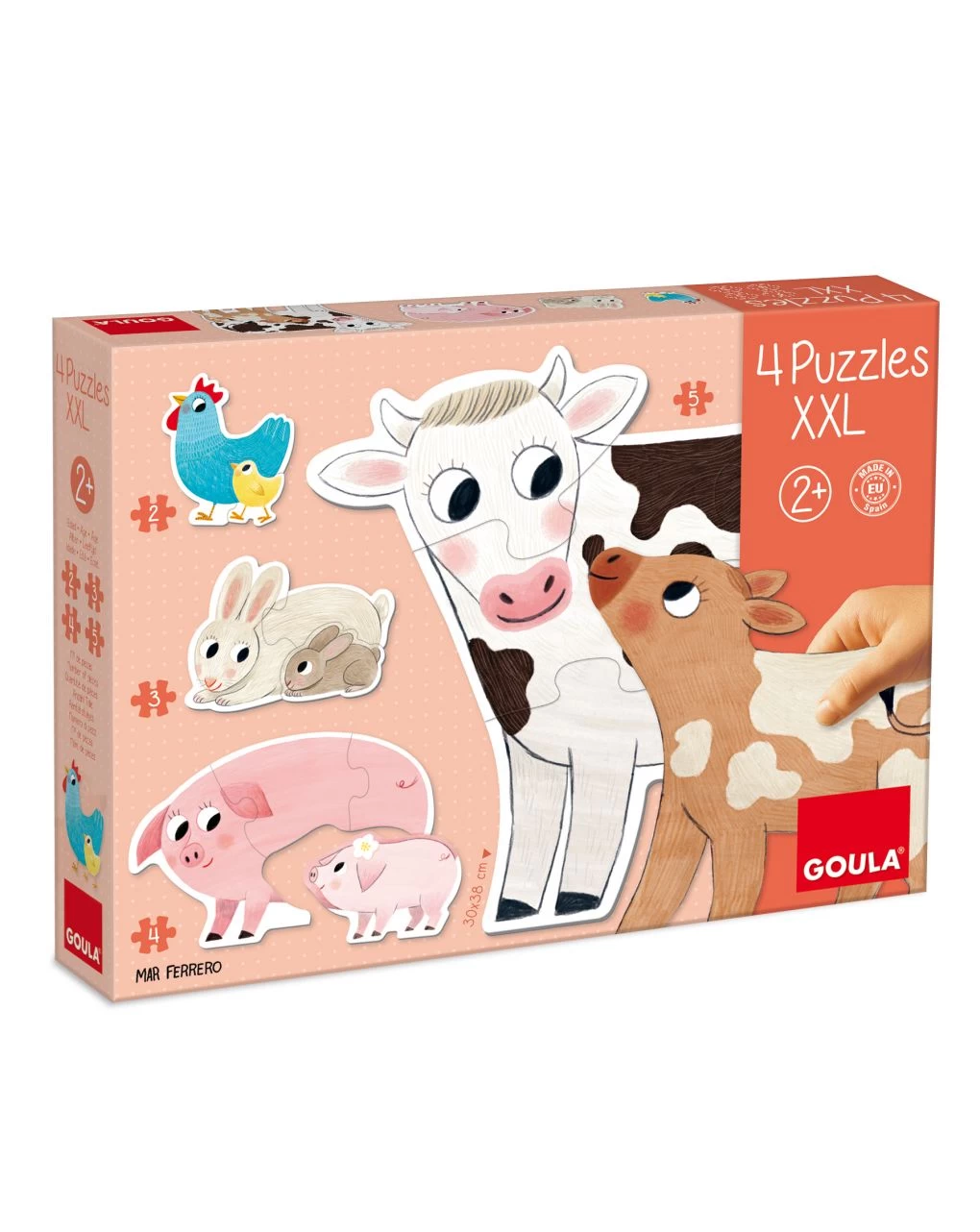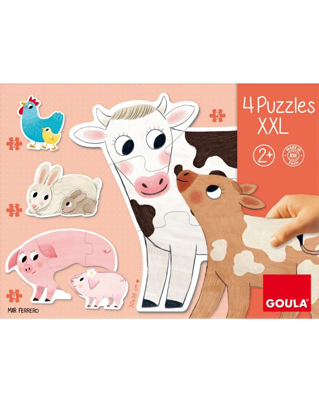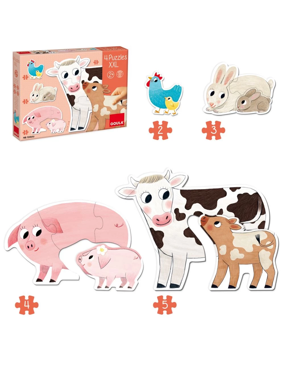 4 puzzle progressivi di cartone in formato XXL da 2, 3, 4 e 5 pezzi. Ambientato nella fattoria, con mamme e bebè! Da 2 anni.