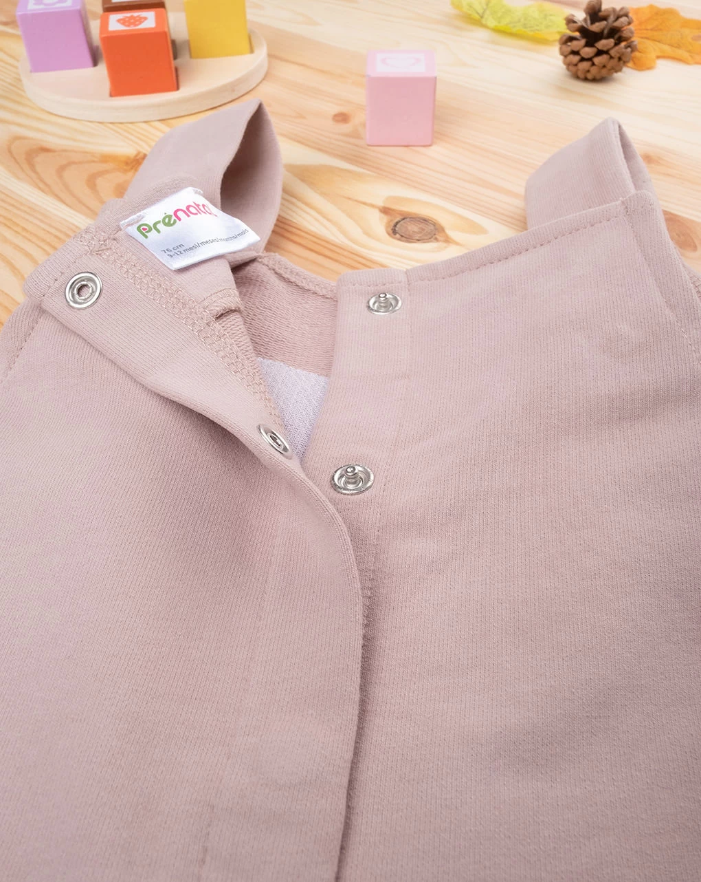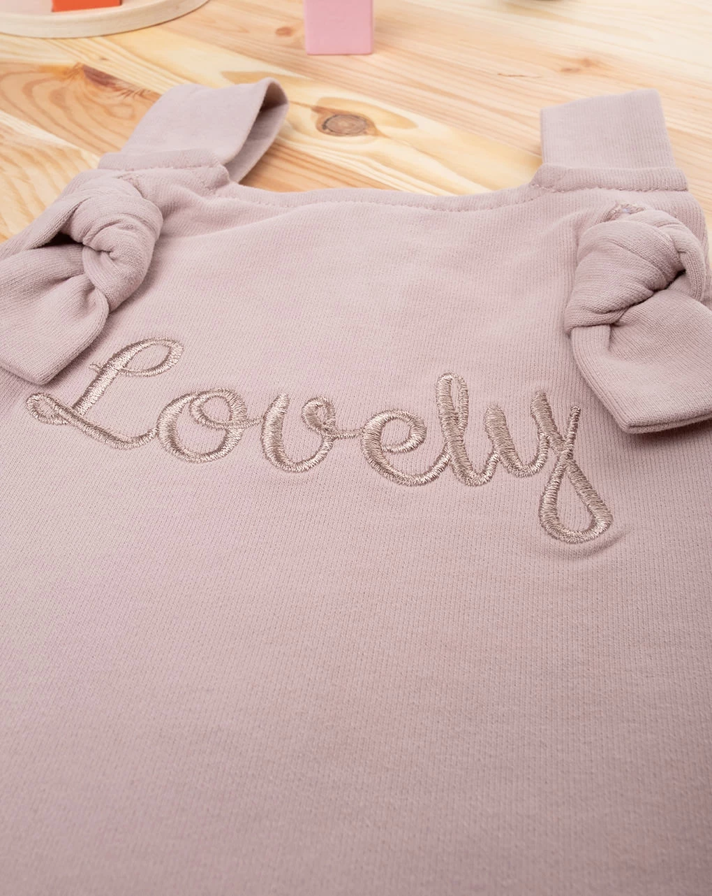Tenera salopette french terry da bambina. Il capo si sviluppa in total rosa antico con ricamo “Lovely” in tono su tono. La vestibilità è morbida e pratica grazie a bottoni automatici sul cavallo e sulle bretelle. La salopette da bambina è adatta per occasioni casual e facilmente abbinabile. Accessori non in vendita. La confezione contiene solo il capo d’abbigliamento