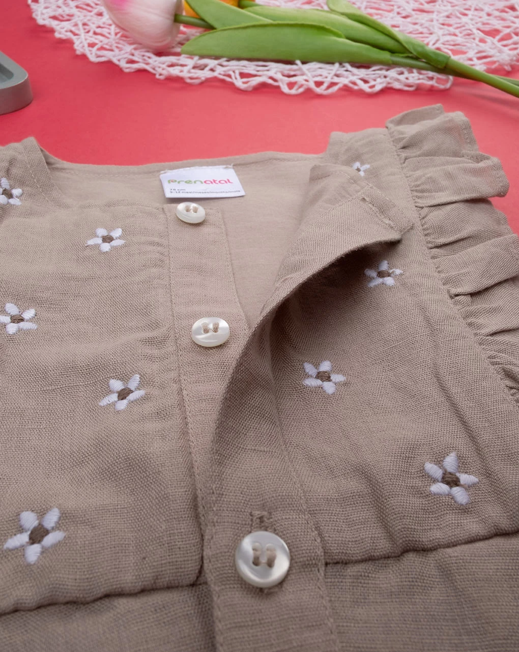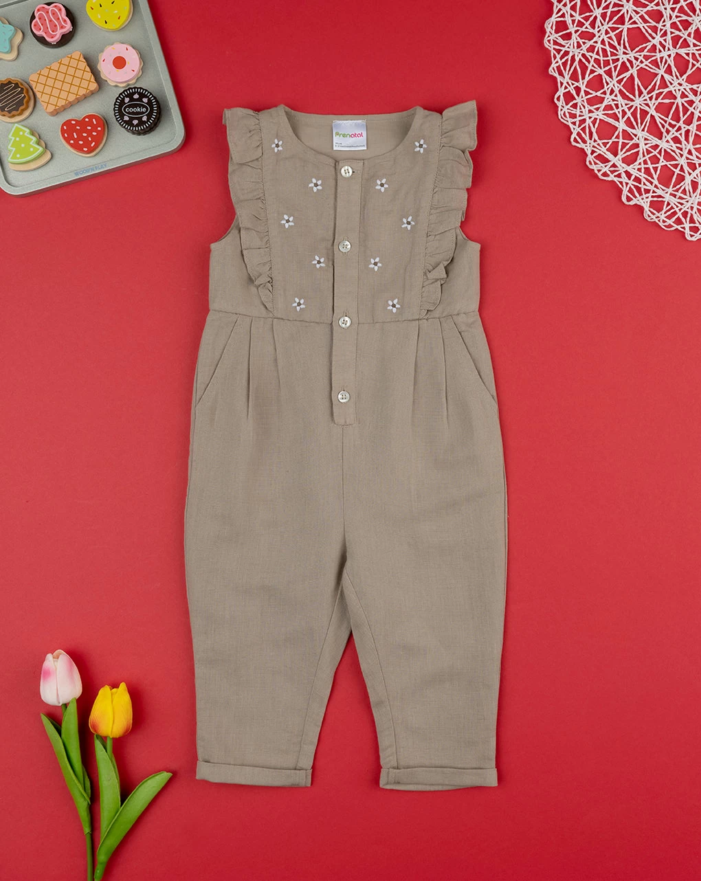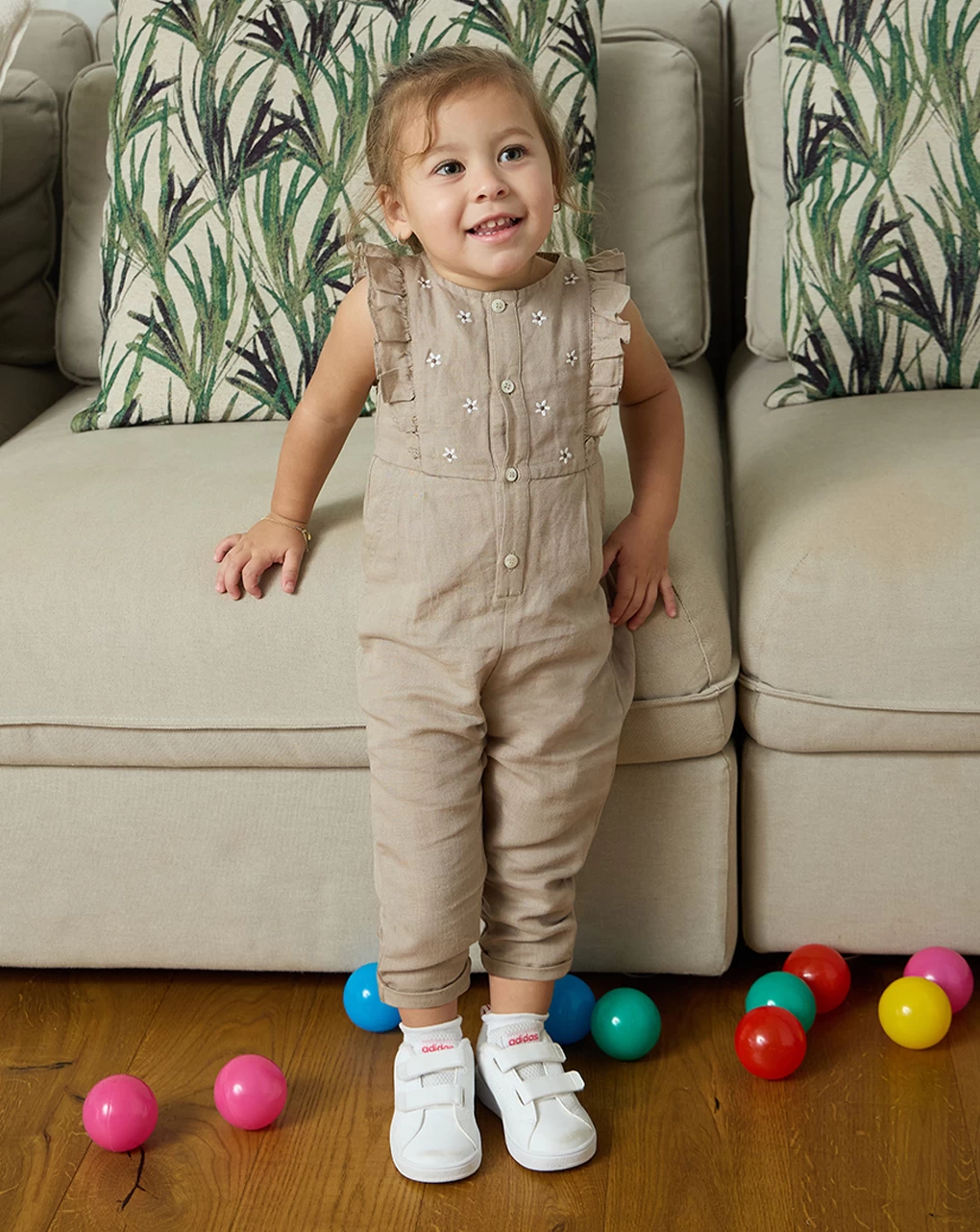 Casual salopette in lino animalier da bambina. Il capo si sviluppa in total marrone kaki con stampa allover di ricamati fiorellini beige nella parte superiore più volant applicato sul giromanica. La vestizione è morbida e pratica grazie ad eleganti bottoni ad asola in tinta sul fronte. La salopette in lino da bambina è adatta per occasioni casual. Accessori non in vendita. La confezione contiene solo il capo d’abbigliamento