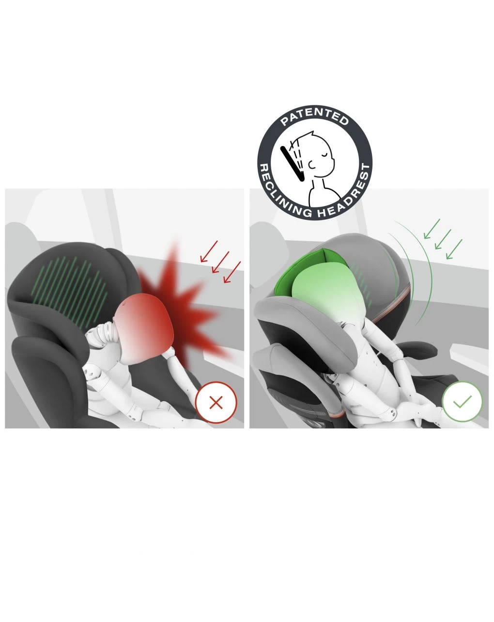 Il poggiatesta reclinabile brevettato aiuta a mantenere la testa del bambino in posizione protetta.