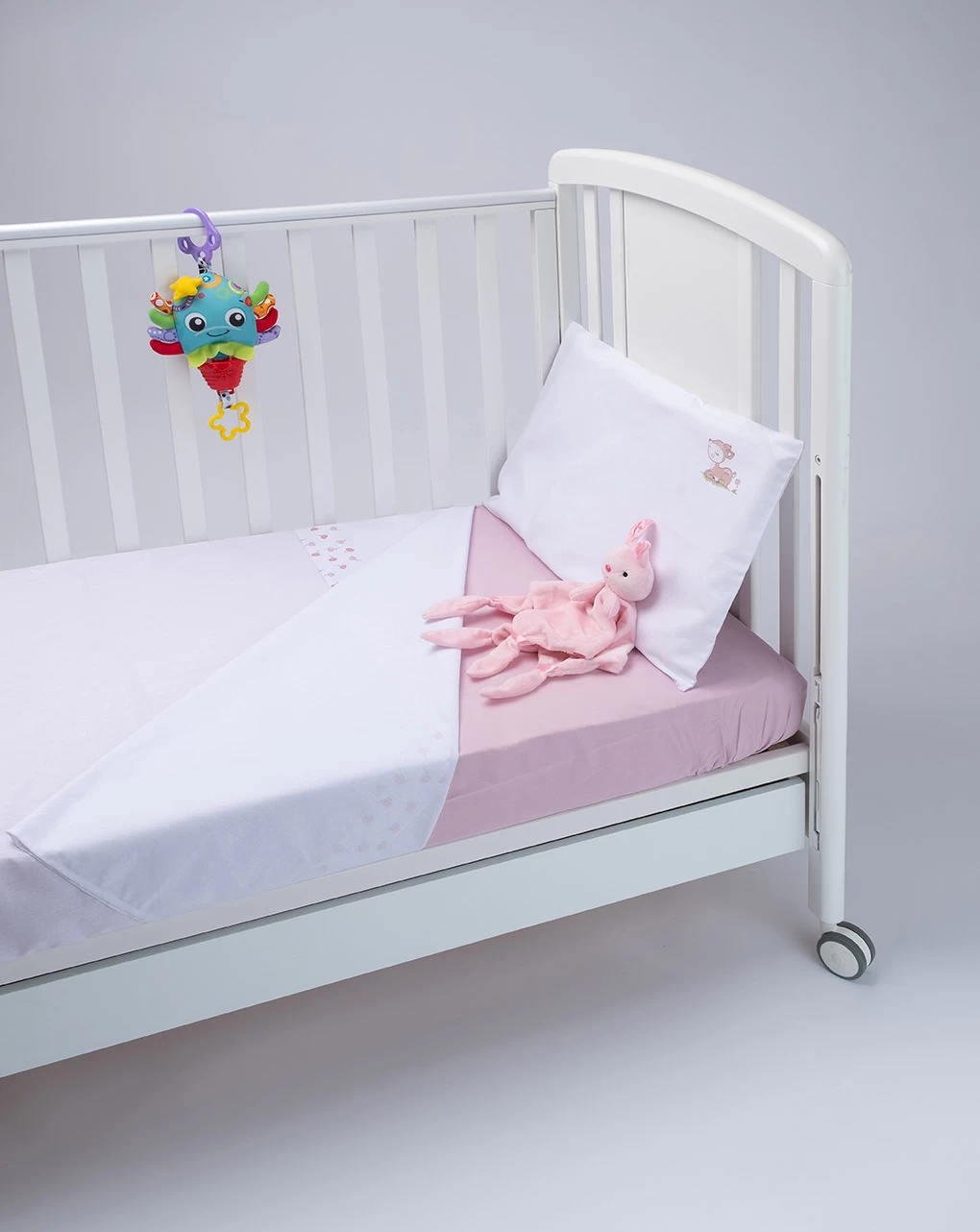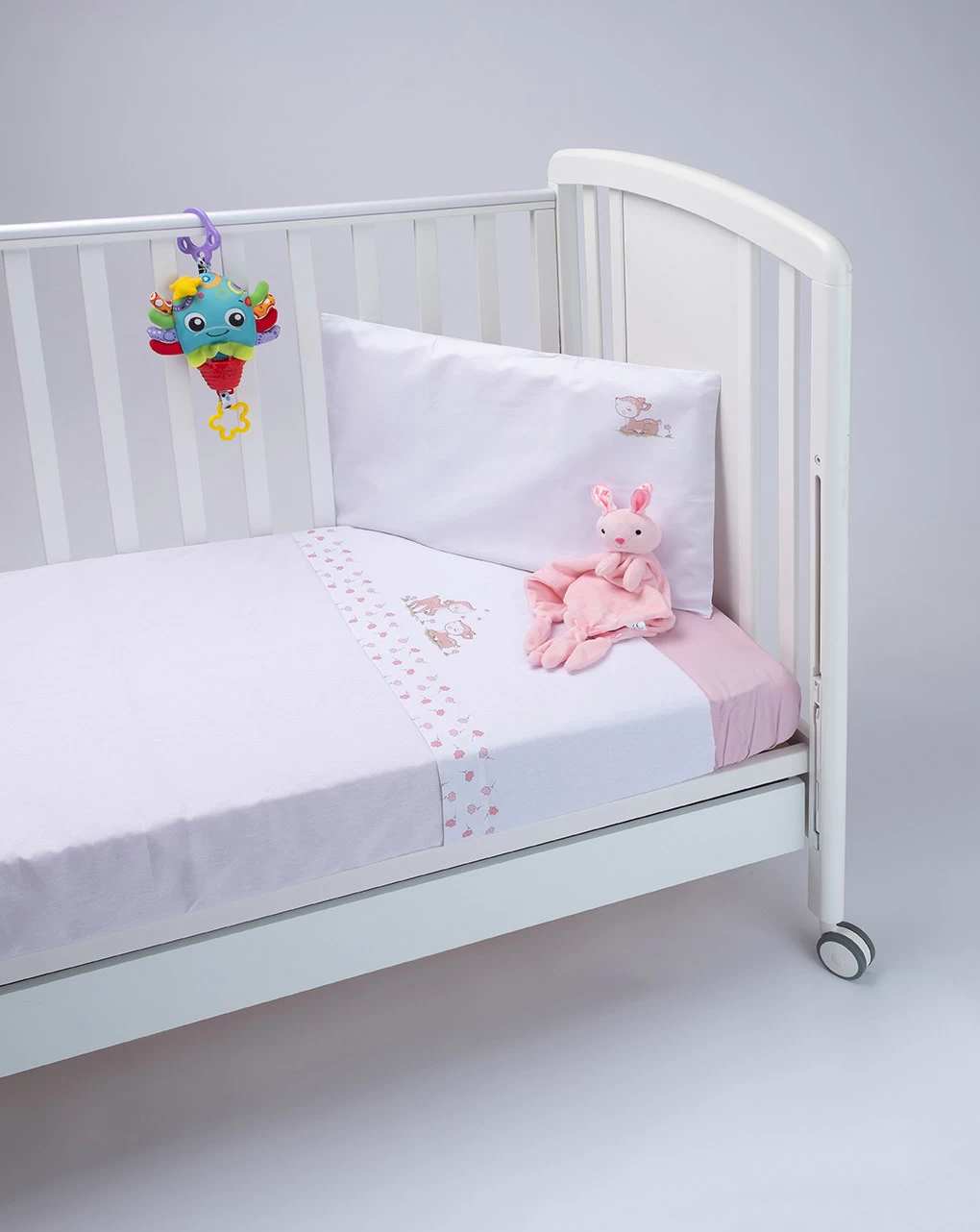 Tenero set letto 3 pezzi da bambina in 100% cotone. Si compone di: federa 35×60 cm, lenzuolo sopra 120×180 cm e lenzuolo sotto 60×135+20 cm. I capi si sviluppano su sfondo bianco e rosa tenue con stampa stilizzato “Cerbiatto” in tinta coordinata. Il set è pratico e confortevole. Accessori non in vendita. La confezione contiene solo il capo d’abbigliamento