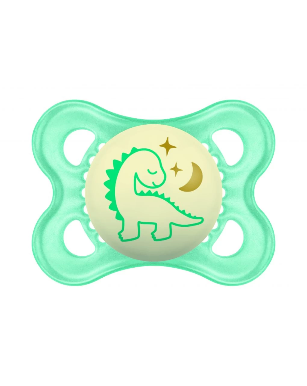 Quando i bambini la notte perdono il ciuccio e i genitori devono cercarlo, si crea per entrambi una situazione di stress. Il pratico ciuccio luminoso Night si illumina al buio. Questa caratteristica lo rende facile da individuare da bambini e genitori, garantendo quindi una notte all’insegna della tranquillità. Il succhietto caucciù viene fornito con una scatolina per il trasporto e la sterilizzazione. Oltre all’effetto luminoso, il ciuccio offre altri numerosi vantaggi. La mascherina e la tettarella simmetriche permettono di adattarsi perfettamente alla bocca del bambino. Inoltre, l’articolo è realizzato in caucciù naturale, un materiale adatto ai dentini dei bambini. La tettarella ha una forma simmetrica, grazie alla quale il ciuccio rimarrà stabilmente posizionato in bocca. La mascherina dispone inoltre di ampie aperture per il passaggio dell’aria, di microrilievi nella parte interna e di bordi arrotondati, che prevengono rossori e irritazioni. Il bottone è stato pensato per essere afferrato da mani di piccole dimensioni, ma al contempo è anche così piatto da adattarsi a qualunque posizione del bimbo.