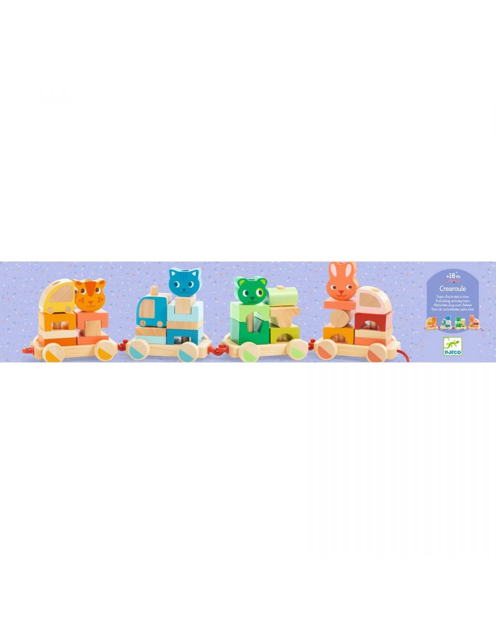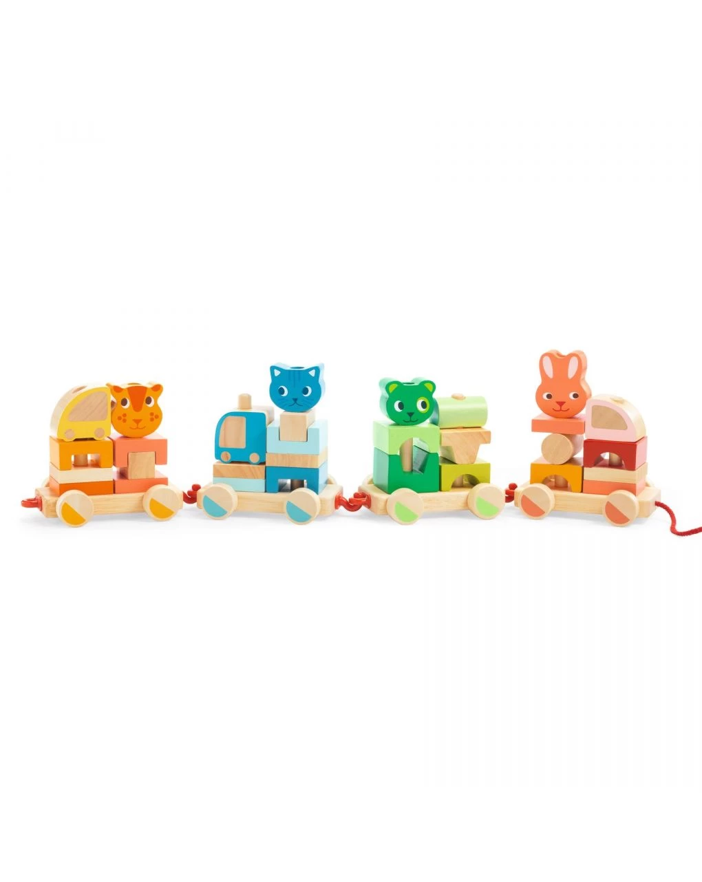 Un treno colorato di legno che i bambini assemblano e decorano seguendo l’immaginazione. Quattro vagoni da unire e dei perni sui quali i bambini collocano degli elementi di legno colorati e illustrati. Scelgono i pezzi che desiderano per creare simpatici passeggeri. Una volta assemblati i pezzi, i bambini tirano il treno con l’aiuto del laccetto. Età: +18m